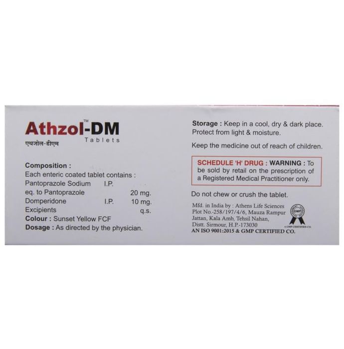 Manufacturer details:                                        Marketer details:Athens Labs Ltd | Unit No 350 , Vardhman Fashion Mall, Pitampura Near Bhagwan Mahavir Hospital New Delhi – 110034 , India,                                                Description:Athzol-DM Tablet is a prescription medicine used to treat gastroesophageal reflux disease (Acid reflux), dyspepsia (indigestion), and gastritis. It helps treat the conditions by reducing the amount of acid in the stomach thereby relieving symptoms of acidity such as heartburn, stomach pain, or irritation. Athzol-DM Tablet also neutralizes the acid in the stomach and promotes easy passage of gas to reduce stomach discomfort. It is taken without food in a dose and duration as advised by the doctor. The dose you are given will depend on your condition and how you respond to the medicine. You should keep taking Athzol-DM Tablet for as long as your doctor recommends. If you stop treatment too early your symptoms may come back and your condition may worsen. Let your healthcare team know about all other medications you are taking as some may affect, or be affected by this medicine.The most common side effects of Athzol-DM Tablet are diarrhea, vomiting, stomach pain, flatulence, dryness in the mouth, and headache. Most of these are temporary and usually resolve with time. Contact your doctor straight away if you are at all concerned about any of these side effects. This medicine may cause dizziness and sleepiness, so do not drive or do anything that requires mental focus until you know how this medicine affects you. Avoid drinking alcohol while taking Athzol-DM Tablet as it can worsen your sleepiness. Lifestyle modifications like having cold milk and avoiding hot tea, coffee, spicy food, or chocolate can help you to get better results.Before you start taking this medicine it is important to inform your doctor if you are suffering from kidney or liver disease. You should also tell your doctor if you are pregnant, planning pregnancy, or breastfeeding.
