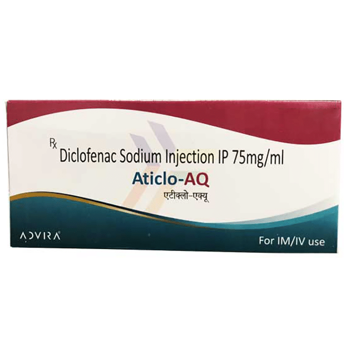 Manufacturer details:                                                                                Marketer details:Advira Technomanagement Private Limited | 147, first floor , srs tower mathura road Haryana , faridabad,                                                                                                Description:Aticlo AQ 75mg Injection is a pain-relieving medicine. It is used to treat pain, swelling, stiffness, and joint pain in conditions like rheumatoid arthritis, osteoarthritis, and acute musculoskeletal injuries. It is given in cases where oral administration is not possible. Aticlo AQ 75mg Injection is administered as an injection by a healthcare professional. Kindly do not self administer. Inform your doctor if you have any history of heart disease or stroke. Please consult your doctor in case any injection site reactions like pain, swelling, or redness are observed.The most common side effects of this medicine include nausea, vomiting, headache, and injection site reactions. Your doctor may regularly monitor your kidney function, liver function, and levels of blood components if you are taking this medicine for long-term treatment. Long term use may lead to serious complications such as stomach bleeding and kidney problems.