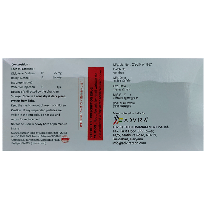 Marketer:Advira Technomanagement Private Limited,Composition:Diclofenac (75mg),medicine_type:,