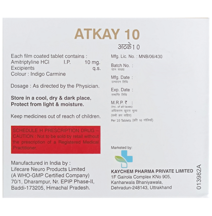 Manufacturer details:                                        Marketer details:Kaychem Pharma Private Limited | 1F Gairola Complex KNo 905, Kanharwala Bhaniyawala, Dehradun-248143, Uttrakhand,                                                Description:Atkay 10 Tablet is a tricyclic antidepressant. Different doses of this medicine help in treating and preventing different problems such as depression, neuropathic pain, and migraine. Atkay 10 Tablet is normally taken before bedtime because it can make you feel sleepy. It can be taken with or without food. The dose and how often you need to take it will be decided by your doctor so that you get the right amount to control your symptoms. The initial dose should be increased with great caution under close supervision. This medicine may not work straight away and it could be several weeks before you get the full effects.How long you need to use it will depend on what you are taking it for, but it is important to continue taking this medication even if you feel well. Do not stop taking the medicine suddenly without talking to your doctor. Stopping the medicine suddenly can worsen your conditions or cause other symptoms. Your dose may be modified or gradually decreased before stopping the medication.The most common side effects of this medicine include nausea, constipation, sweating, dry mouth, sleepiness, tremor, dizziness, headache, speech disorder, accommodation disorder, increased heart rate, orthostatic hypotension, and nasal congestion. It may also make you aggressive or confused and can lead to weight gain in some people.This medicine is not addictive, but you can experience additional side effects (withdrawal symptoms) if you stop taking it suddenly. Most of the common side effects tend to be mild. Your doctor may be able to suggest ways of preventing or reducing side effects if they bother you or do not go away. Serious side effects associated with this medicine are rare.