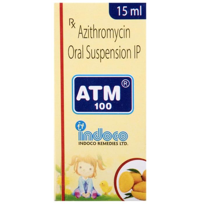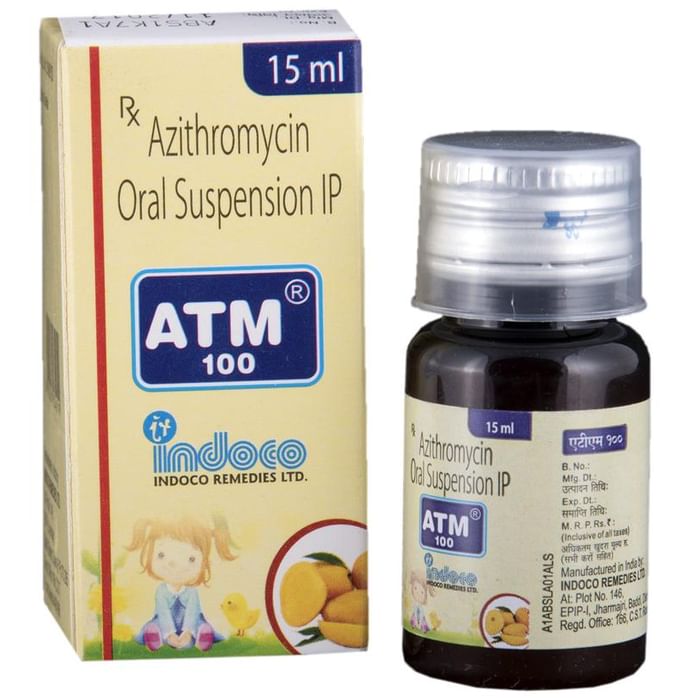Manufacturer details:                                        Marketer details:Indoco Remedies Ltd | Indoco House, 166 CST Road, Santacruz (E), Mumbai 400 098, INDIA,                                                Description:ATM 100 Oral Suspension is an antibiotic medication. It is commonly given to children for the treatment of a wide range of bacterial infections targeting the ear, eyes, nose, throat, lungs, skin, and gastrointestinal tract. ATM 100 Oral Suspension works by inhibiting the growth of the infection-causing bacteria and stopping it from multiplying. As a result of this, the spread of the infection is disabled. ATM 100 Oral Suspension is usually given once a day, preferably in the morning. However, in the case of typhoid, it is to be given twice. Give it with or without food at about the same time each day. However, it is best given with food since children often have a sensitive stomach and could easily get a stomach upset.Medicine dose depends on the type of infection your child has, its severity, and your child’s age and body weight. So stick to the dose, time, and way prescribed by the doctor. In case your child vomits within 30 minutes of taking this medicine, give the same dose again.Your child may start to feel better within 2 days of regular dosing. However, you must still complete the full prescribed course of the medicine and never stop it abruptly as that may worsen your child’s condition or increase the risk of reinfection. Some of the minor and temporary side effects of this medicine include vomiting, diarrhea, nausea, and stomach pain. Usually, these episodes subside once your child’s body adapts to the medicine. However, in case these effects persist or become bothersome for your child, consult your child’s doctor without any delay.Inform your child’s doctor about any previous episode of any allergy, heart problem, liver impairment, and kidney malfunction. Knowing the child’s medical history is critical for dose alterations and for planning your child’s overall treatment.