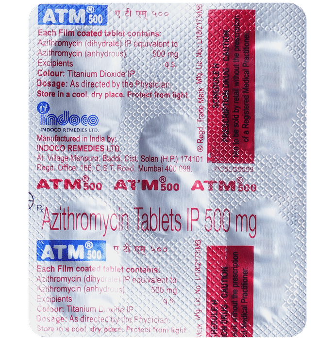 Manufacturer details:                                                                                Marketer details:Indoco Remedies Ltd | Indoco House, 166 CST Road, Santacruz (E), Mumbai 400 098, INDIA,                                                                                                Description:ATM 500 Tablet is an antibiotic used to treat various types of bacterial infections of the respiratory tract, ear, nose, throat, lungs, skin, and eye in adults and children. It is also effective in typhoid fever and some sexually transmitted diseases like gonorrhea.ATM 500 Tablet is taken orally, preferably one hour before or 2 hours after a meal. It should be used regularly at evenly spaced time intervals as prescribed by your doctor. Do not skip any doses and finish the full course of treatment even if you feel better. Stopping the medicine too early may lead to the return or worsening of the infection.Commonly seen side effects seen with this medicine include vomiting, nausea, stomach pain, headache, and diarrhea. These are usually temporary and subside with the completion of treatment. Consult your doctor if you find these side effects worry you or persist for a longer duration.Do not use ATM 500 Tablet if you have a history of cholestatic jaundice or hepatic dysfunction that happened with the use of azithromycin. Inform your doctor if you have any previous history of allergy or heart problems before taking this medicine. Pregnant or breastfeeding women should consult their doctor before using this medicine.