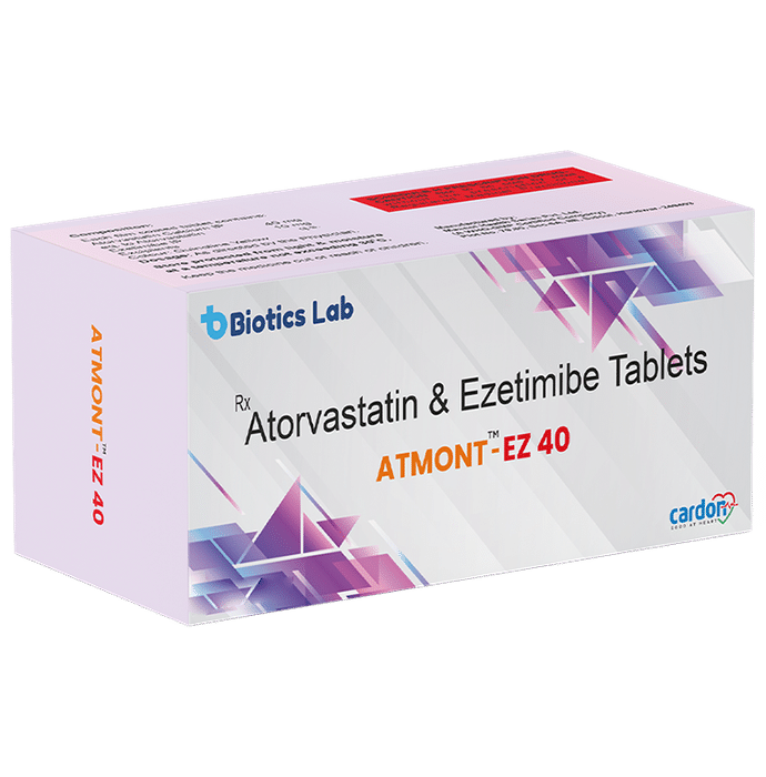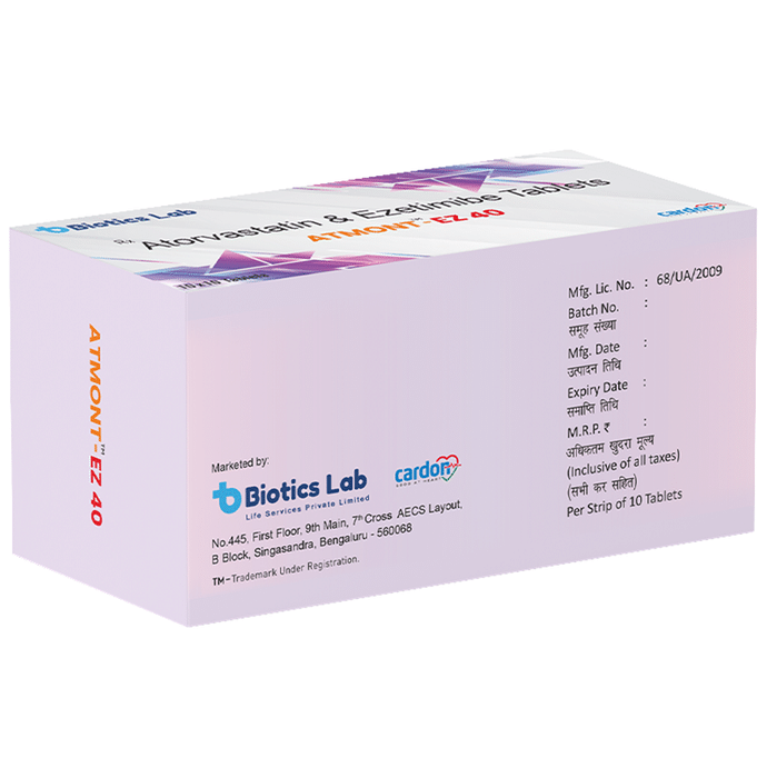 Manufacturer details:                                        Marketer details:Biotics Lab Life Services Private Limited | 22/255A, Pipe Line Road, Thikkakkara North Kalamassery, Ernakulam, Kerala, 683503,                                                Description:Atmont-EZ 40 Tablet is a medicine used to treat high cholesterol. It is a combination of two medicines that reduces ‘__’bad’__’ cholesterol (LDL) and triglycerides (fats) levels. Atmont-EZ 40 Tablet can be taken with or without food. You should take it regularly at evenly spaced intervals as per the schedule prescribed by your doctor. Taking it at the same time every day will help you remember to take it. The dose and duration of treatment will depend on what you are being treated for. Do not stop taking it until you have finished the complete course, even when you feel better. You can help this medicine work better by making a few changes to your lifestyle such as keeping active, stopping smoking, eating a healthy low-fat diet and exercise regularly.Nausea, stomach pain, constipation, and muscle pain are some common side effects of this medicine. These are usually mild but let your doctor know if they bother you or last more than a few days. Let your doctor know if you notice yellowing of skin or eyes, unusually dark urine or dark stools as it might be symptoms of liver damage. You may be asked for regular monitoring of blood sugar level, and liver function while taking this medicine.Before taking this medicine, let your doctor know if you have any kidney or liver problems or high blood pressure. Pregnant or breastfeeding women should also consult their doctor before taking it. You should also let your healthcare team know all other medicines you are taking as they may affect, or be affected by this medicine.