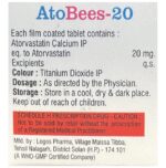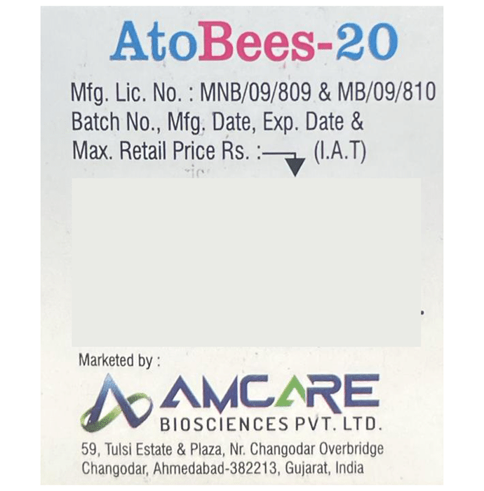 Manufacturer details:                                        Marketer details:Amcare Pharmaceuticals | 127,128 1st floor, chirag plaza near manav ashram chowkdi, Visnagar road, Mehsana-384001, Mehsana-384001, Gujarat, India,                                                Description:Atobees 20 Tablet belongs to a group of medicines called statins. It is used to lower cholesterol and to reduce the risk of heart diseases. Cholesterol is a fatty substance that builds up in your blood vessels and causes narrowing, which may lead to a heart attack or stroke. Atobees 20 Tablet is a widely prescribed medicine and is regarded as safe for long-term use when taken as per the doctor’s advice. It can be taken with a meal or on an empty stomach. You can take it at any time of the day but try to take it at about the same time each day. Most people with high cholesterol do not feel ill, but stopping your medicine may increase your cholesterol levels thereby increasing your risk of heart disease and stroke.It is important to have your cholesterol levels checked regularly. This medicine is only one part of the treatment program which should also include a healthy diet, regular exercise, smoking cessation, moderation of alcohol intake, and weight reduction. You can eat normally while taking this medicine, but try to avoid foods that are high in fat. Common side effects of this medicine include constipation, flatulence, dyspepsia, and abdominal pain. These are usually mild and disappear after a short time. Consult your doctor if they persist or if you notice any yellowing of your eyes or get repeated or unexplained muscle pains. This medicine should not be used in some conditions such as liver disease. Also, pregnant women and breastfeeding mothers should not take this medicine as it may harm the developing baby. Diabetic patients should monitor their blood sugar levels while taking this medicine, as it may lead to an increase in blood sugar levels. Your doctor may check your liver function before starting the treatment and monitor it regularly thereafter.