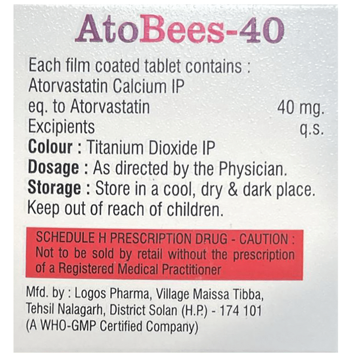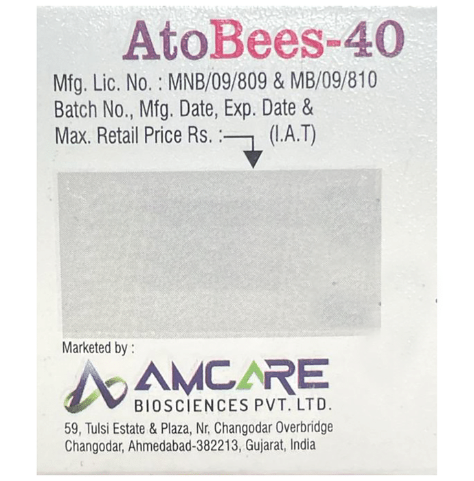 Manufacturer details:                                                                                Marketer details:Amcare Pharmaceuticals | 127,128 1st floor, chirag plaza near manav ashram chowkdi, Visnagar road, Mehsana-384001, Mehsana-384001, Gujarat, India,                                                                                                Description:Atobees 40 Tablet belongs to a group of medicines called statins. It is used to lower cholesterol and to reduce the risk of heart diseases. Cholesterol is a fatty substance that builds up in your blood vessels and causes narrowing, which may lead to a heart attack or stroke. Atobees 40 Tablet is a widely prescribed medicine and is regarded as safe for long-term use when taken as per the doctor’s advice. It can be taken with a meal or on an empty stomach. You can take it at any time of the day but try to take it at about the same time each day. Most people with high cholesterol do not feel ill, but stopping your medicine may increase your cholesterol levels thereby increasing your risk of heart disease and stroke.It is important to have your cholesterol levels checked regularly. This medicine is only one part of the treatment program which should also include a healthy diet, regular exercise, smoking cessation, moderation of alcohol intake, and weight reduction. You can eat normally while taking this medicine, but try to avoid foods that are high in fat. Common side effects of this medicine include constipation, flatulence, dyspepsia, and abdominal pain. These are usually mild and disappear after a short time. Consult your doctor if they persist or if you notice any yellowing of your eyes or get repeated or unexplained muscle pains. This medicine should not be used in some conditions such as liver disease. Also, pregnant women and breastfeeding mothers should not take this medicine as it may harm the developing baby. Diabetic patients should monitor their blood sugar levels while taking this medicine, as it may lead to an increase in blood sugar levels. Your doctor may check your liver function before starting the treatment and monitor it regularly thereafter.