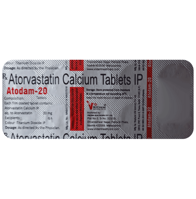 Manufacturer details:                                                                                Marketer details:Vridam Healthcare Pvt Ltd | Plot No-3, Sr. No. 323, 2B, Dnyaneshwar Nagar, Pathardi Phata, Nashik, Maharashtra 422009, Mobile No. 9970325741,                                                                                                Description:Atodam 20 Tablet belongs to a group of medicines called statins. It is used to lower cholesterol and to reduce the risk of heart diseases. Cholesterol is a fatty substance that builds up in your blood vessels and causes narrowing, which may lead to a heart attack or stroke. Atodam 20 Tablet is a widely prescribed medicine and is regarded as safe for long-term use when taken as per the doctor’s advice. It can be taken with a meal or on an empty stomach. You can take it at any time of the day but try to take it at about the same time each day. Most people with high cholesterol do not feel ill, but stopping your medicine may increase your cholesterol levels thereby increasing your risk of heart disease and stroke.It is important to have your cholesterol levels checked regularly. This medicine is only one part of the treatment program which should also include a healthy diet, regular exercise, smoking cessation, moderation of alcohol intake, and weight reduction. You can eat normally while taking this medicine, but try to avoid foods that are high in fat. Common side effects of this medicine include constipation, flatulence, dyspepsia, and abdominal pain. These are usually mild and disappear after a short time. Consult your doctor if they persist or if you notice any yellowing of your eyes or get repeated or unexplained muscle pains. This medicine should not be used in some conditions such as liver disease. Also, pregnant women and breastfeeding mothers should not take this medicine as it may harm the developing baby. Diabetic patients should monitor their blood sugar levels while taking this medicine, as it may lead to an increase in blood sugar levels. Your doctor may check your liver function before starting the treatment and monitor it regularly thereafter.