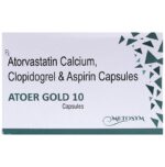 Manufacturer details: Marketer details:Xender Biopharma & Research Llp. | Shop No. S/8, Silver Point, OPP. Vidhyabharti School, Bhatar Char Rasta, Surat. Tal: Surat City (Surat) – 395001, Description:Atoer Gold 10 Capsule is used for the prevention of heart attack. It is a combination of medicines that prevent clot formation in the blood vessels. It also helps to reduce increased cholesterol and triglycerides levels. Atoer Gold 10 Capsule should be taken with food regularly at a fixed time each day. You should take it regularly at evenly spaced intervals as per the schedule prescribed by your doctor. Taking it at the same time every day will help you remember to take it. The dose and duration of treatment will depend on what you are being treated for. Do not stop taking it until you have finished the complete course, even when you feel better. Lifestyle changes like a low-fat diet, exercise, and not smoking may help this medicine to work better.Abdominal pain, indigestion, bruising, and nosebleeds are some common side effects of this medicine. This medicine increases your risk of bleeding, so it is important to be careful while shaving, cutting nails, and using sharp objects. Let your doctor know if you notice muscle symptoms (pain or weakness), yellowing of the skin, and dark urine. Usually, it is advisable to avoid alcohol intake while taking this medicine.Before taking this medicine, tell your doctor if you have any liver or kidney disease. You must tell your doctor if you are pregnant, planning pregnancy, or breastfeeding. You should also let your healthcare team know all other medicines you are taking as they may affect, or be affected by this medicine.