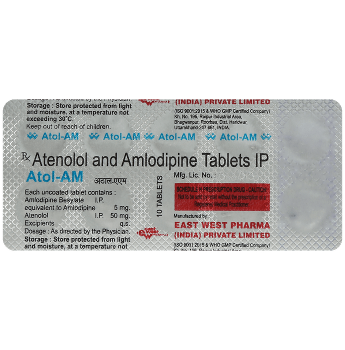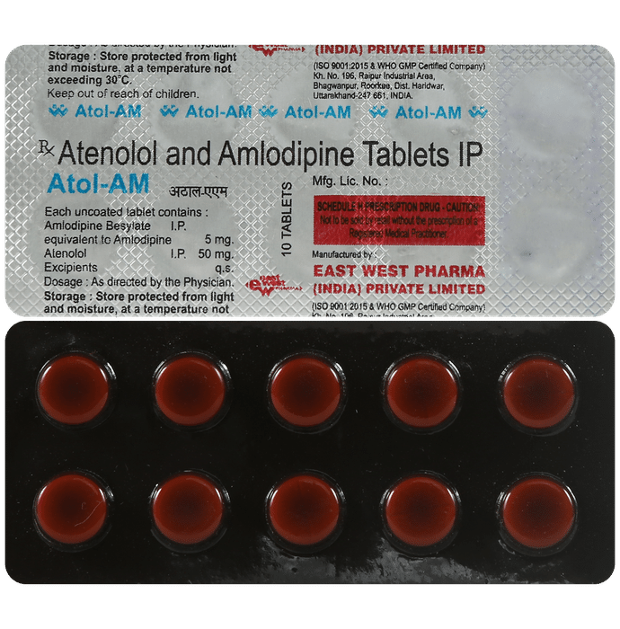 Manufacturer details:                                        Marketer details:East West Pharma | No. 10, 2nd Cross, Maravaneri, Salem – 636007, Tamil Nadu.,                                                Description:Atol AM Tablet is used to treat hypertension (high blood pressure) and angina. This is a combination of two medicines that controls blood pressure when a single medication is not effective. It helps to lower high blood pressure and thus reduces the chances of future heart attack and stroke. Atol AM Tablet may be taken with or without food. Take it at the same time each day. Keep taking it for as long as advised by your doctor. Even if you feel well, do not stop this medicine on your own because high blood pressure often has no symptoms. If you stop taking it, your condition may get worse. Keeping active with regular exercise, reducing your weight and eating a healthy diet will also help control your blood pressure. Follow your doctor’s advice while taking this medicine.It may cause side effects like headache, slow heart rate, and nausea. It may also cause dizziness, so do not drive or do anything that requires mental focus until you know how this medicine affects you. This might raise the level of potassium in the blood, hence avoid potassium rich food or supplements. You may be asked for regular monitoring of blood pressure, kidney function, and electrolytes level while on the treatment.Before taking it, let your doctor know if you have any liver or kidney problems. Pregnant or breastfeeding women should also consult their doctor for advice before taking this medicine. You also need to tell your doctor what other medicines you are taking especially those used to treat high blood pressure or heart conditions.