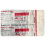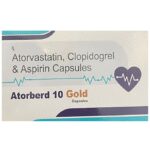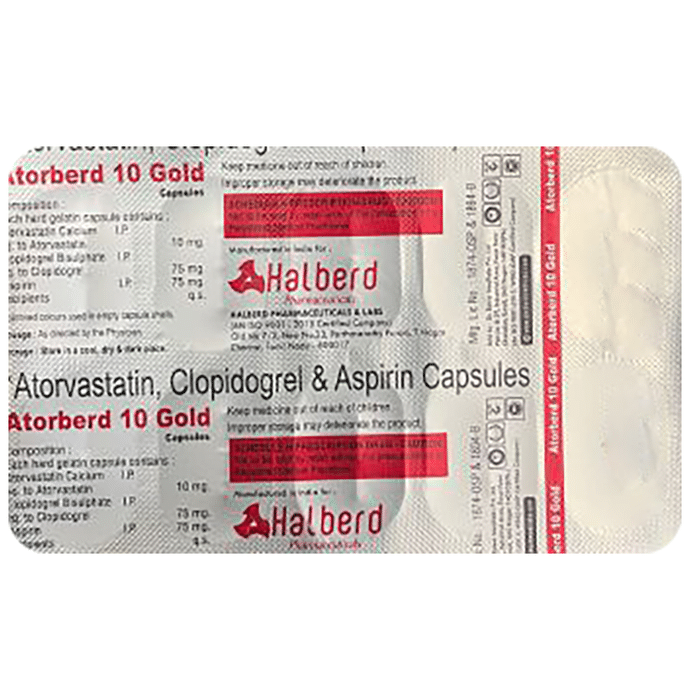 Manufacturer details: Marketer details:Halberd Pharmaceuticals | HALBERD PHARMACEUTICALS, OLD NO 7/2, NEW NO: 33, PARTHASARATHY PURAM, T NAGAR, CHENNAI, TAMILNADU -600022, Description:Atorberd 10 Gold Capsule is used for the prevention of heart attack. It is a combination of medicines that prevent clot formation in the blood vessels. It also helps to reduce increased cholesterol and triglycerides levels. Atorberd 10 Gold Capsule should be taken with food regularly at a fixed time each day. You should take it regularly at evenly spaced intervals as per the schedule prescribed by your doctor. Taking it at the same time every day will help you remember to take it. The dose and duration of treatment will depend on what you are being treated for. Do not stop taking it until you have finished the complete course, even when you feel better. Lifestyle changes like a low-fat diet, exercise, and not smoking may help this medicine to work better.Abdominal pain, indigestion, bruising, and nosebleeds are some common side effects of this medicine. This medicine increases your risk of bleeding, so it is important to be careful while shaving, cutting nails, and using sharp objects. Let your doctor know if you notice muscle symptoms (pain or weakness), yellowing of the skin, and dark urine. Usually, it is advisable to avoid alcohol intake while taking this medicine.Before taking this medicine, tell your doctor if you have any liver or kidney disease. You must tell your doctor if you are pregnant, planning pregnancy, or breastfeeding. You should also let your healthcare team know all other medicines you are taking as they may affect, or be affected by this medicine.