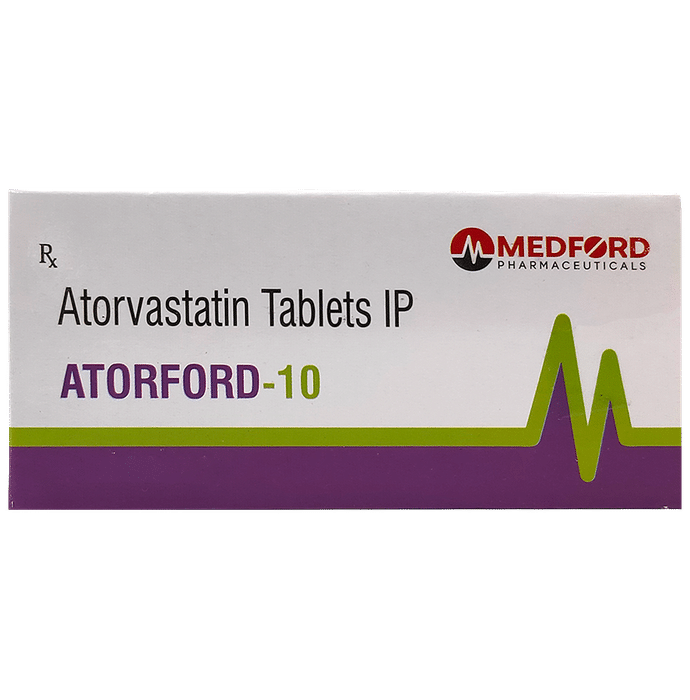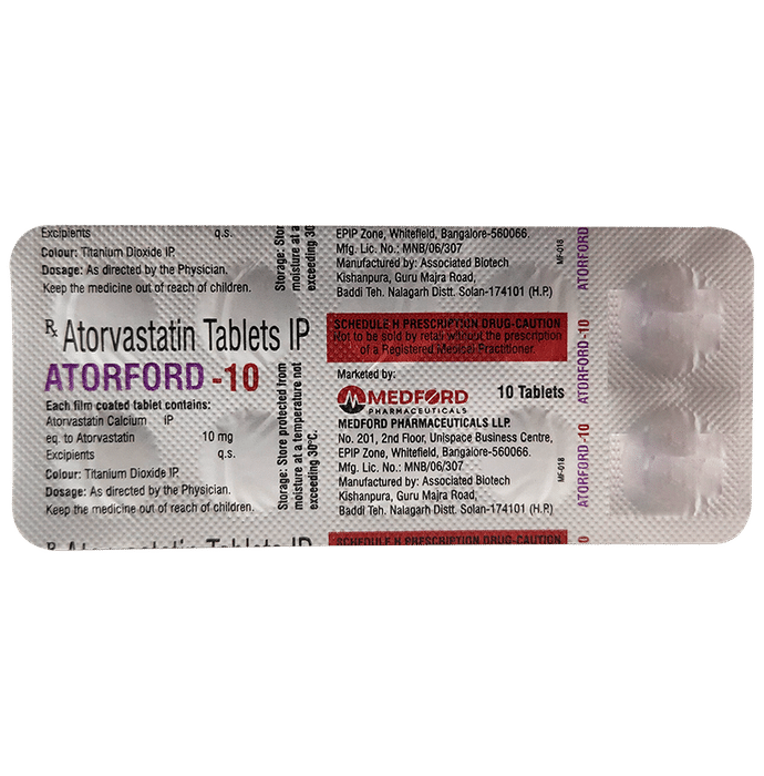 Manufacturer details:                                        Marketer details:Medford Pharmaceuticals | No.201, 2nd Floor, Unispace Business Centre, Whitefield, Bangalore-560066. INDIA,                                                Description:Atorford 10 Tablet belongs to a group of medicines called statins. It is used to lower cholesterol and to reduce the risk of heart diseases. Cholesterol is a fatty substance that builds up in your blood vessels and causes narrowing, which may lead to a heart attack or stroke. Atorford 10 Tablet is a widely prescribed medicine and is regarded as safe for long-term use when taken as per the doctor’s advice. It can be taken with a meal or on an empty stomach. You can take it at any time of the day but try to take it at about the same time each day. Most people with high cholesterol do not feel ill, but stopping your medicine may increase your cholesterol levels thereby increasing your risk of heart disease and stroke.It is important to have your cholesterol levels checked regularly. This medicine is only one part of the treatment program which should also include a healthy diet, regular exercise, smoking cessation, moderation of alcohol intake, and weight reduction. You can eat normally while taking this medicine, but try to avoid foods that are high in fat. Common side effects of this medicine include constipation, flatulence, dyspepsia, and abdominal pain. These are usually mild and disappear after a short time. Consult your doctor if they persist or if you notice any yellowing of your eyes or get repeated or unexplained muscle pains. This medicine should not be used in some conditions such as liver disease. Also, pregnant women and breastfeeding mothers should not take this medicine as it may harm the developing baby. Diabetic patients should monitor their blood sugar levels while taking this medicine, as it may lead to an increase in blood sugar levels. Your doctor may check your liver function before starting the treatment and monitor it regularly thereafter.