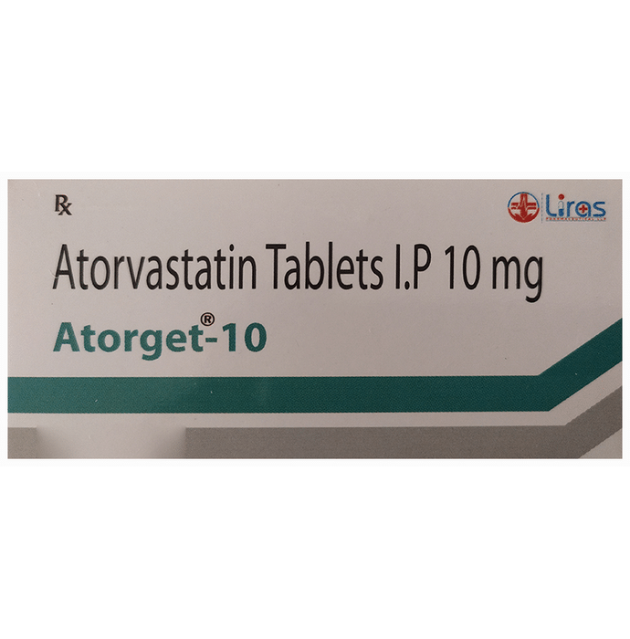 Manufacturer details:                                                                                Marketer details:Liras Pharmaceutical LLP | AL ARSH BUILDING,OLAVANNA,CALICUT,                                                                                                Description:Atorget 10 Tablet belongs to a group of medicines called statins. It is used to lower cholesterol and to reduce the risk of heart diseases. Cholesterol is a fatty substance that builds up in your blood vessels and causes narrowing, which may lead to a heart attack or stroke. Atorget 10 Tablet is a widely prescribed medicine and is regarded as safe for long-term use when taken as per the doctor’s advice. It can be taken with a meal or on an empty stomach. You can take it at any time of the day but try to take it at about the same time each day. Most people with high cholesterol do not feel ill, but stopping your medicine may increase your cholesterol levels thereby increasing your risk of heart disease and stroke.It is important to have your cholesterol levels checked regularly. This medicine is only one part of the treatment program which should also include a healthy diet, regular exercise, smoking cessation, moderation of alcohol intake, and weight reduction. You can eat normally while taking this medicine, but try to avoid foods that are high in fat. Common side effects of this medicine include constipation, flatulence, dyspepsia, and abdominal pain. These are usually mild and disappear after a short time. Consult your doctor if they persist or if you notice any yellowing of your eyes or get repeated or unexplained muscle pains. This medicine should not be used in some conditions such as liver disease. Also, pregnant women and breastfeeding mothers should not take this medicine as it may harm the developing baby. Diabetic patients should monitor their blood sugar levels while taking this medicine, as it may lead to an increase in blood sugar levels. Your doctor may check your liver function before starting the treatment and monitor it regularly thereafter.