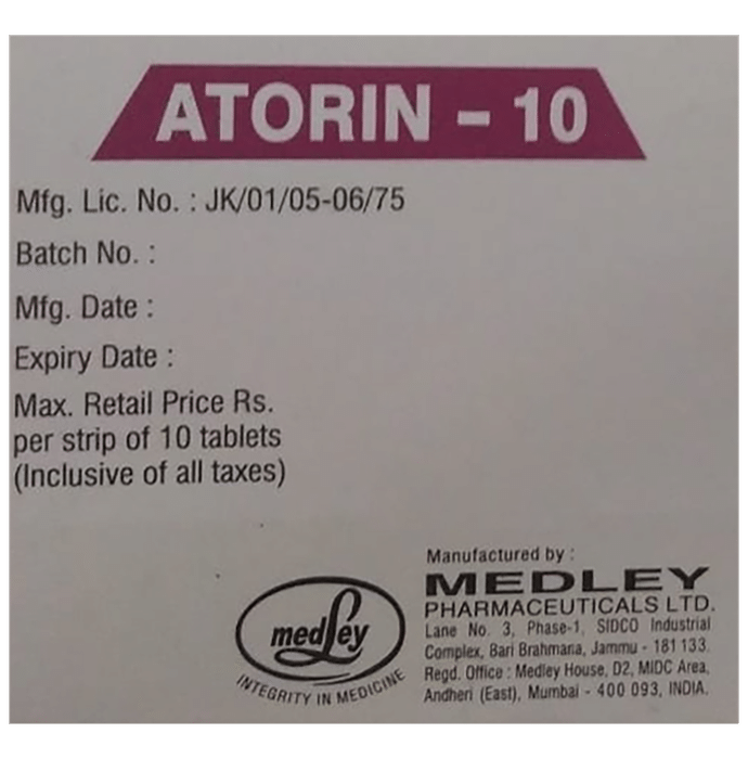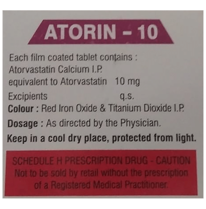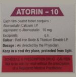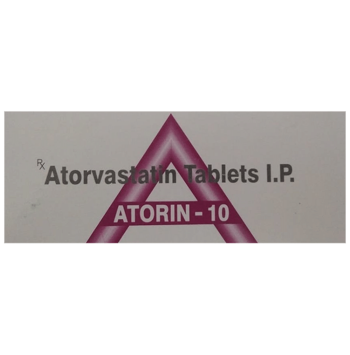 Atorin 10 Tablet belongs to a group of medicines called statins. It is used to lower cholesterol and to reduce the risk of heart diseases. Cholesterol is a fatty substance that builds up in your blood vessels and causes narrowing, which may lead to a heart attack or stroke. Atorin 10 Tablet is a widely prescribed medicine and is regarded as safe for long-term use when taken as per the doctor’s advice. It can be taken with a meal or on an empty stomach. You can take it at any time of the day but try to take it at about the same time each day. Most people with high cholesterol do not feel ill, but stopping your medicine may increase your cholesterol levels thereby increasing your risk of heart disease and stroke.It is important to have your cholesterol levels checked regularly. This medicine is only one part of the treatment program which should also include a healthy diet, regular exercise, smoking cessation, moderation of alcohol intake, and weight reduction. You can eat normally while taking this medicine, but try to avoid foods that are high in fat. Common side effects of this medicine include constipation, flatulence, dyspepsia, and abdominal pain. These are usually mild and disappear after a short time. Consult your doctor if they persist or if you notice any yellowing of your eyes or get repeated or unexplained muscle pains. This medicine should not be used in some conditions such as liver disease. Also, pregnant women and breastfeeding mothers should not take this medicine as it may harm the developing baby. Diabetic patients should monitor their blood sugar levels while taking this medicine, as it may lead to an increase in blood sugar levels. Your doctor may check your liver function before starting the treatment and monitor it regularly thereafter.