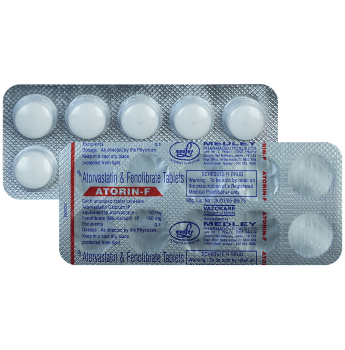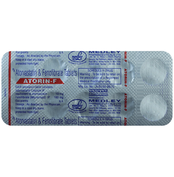Atorin-F Tablet is a combination of two lipids (fat) lowering medicines. It is used to lower the levels of lipids known as cholesterol and triglycerides in the blood when lifestyle changes (eg. low-fat diet) on their own have failed. This medicine helps to reduce the risk of heart disease. Atorin-F Tablet can be taken with a meal or on an empty stomach. You can take it at any time of the day but try to take it at the same time each day. This will help you remember to take it. Your doctor will prescribe the right dose depending on your lipid levels and how you respond to this medicine. Most people with high cholesterol and triglyceride do not feel ill, but stopping your medicine may increase your lipid levels, making your condition worse and increasing your risk of heart disease and stroke.It is important to have your cholesterol and triglyceride levels (lipid profile) checked regularly. This medicine is only one part of a treatment program which should also include a healthy low-fat diet, regular exercise, smoking cessation, moderation of alcohol intake, and weight reduction. You can eat normally while taking this medicine, but try to avoid foods that are high in fat.Nausea, stomach pain, diarrhea, constipation, headache, insomnia, flatulence (excessive gas), and muscle pain are some of the common side effects of this medicine. These are usually mild and disappear after a short time. Consult your doctor if they persist or if you notice any yellowing of your eyes, unusual bleeding or bruising, or get repeated, severe, or unexplained muscle pains. You may be advised to get your liver function tested periodically while taking this medicine.This medicine should not be used in conditions such as liver disease (eg. abnormal blood tests for liver function, persistent yellowness of eyes, etc.). Before taking it, let your doctor know if you have any kidney-related problems or if you are pregnant, planning a pregnancy, or breastfeeding. Diabetic patients should monitor their blood sugar levels while taking this medicine, as it may lead to an increase in blood sugar levels.