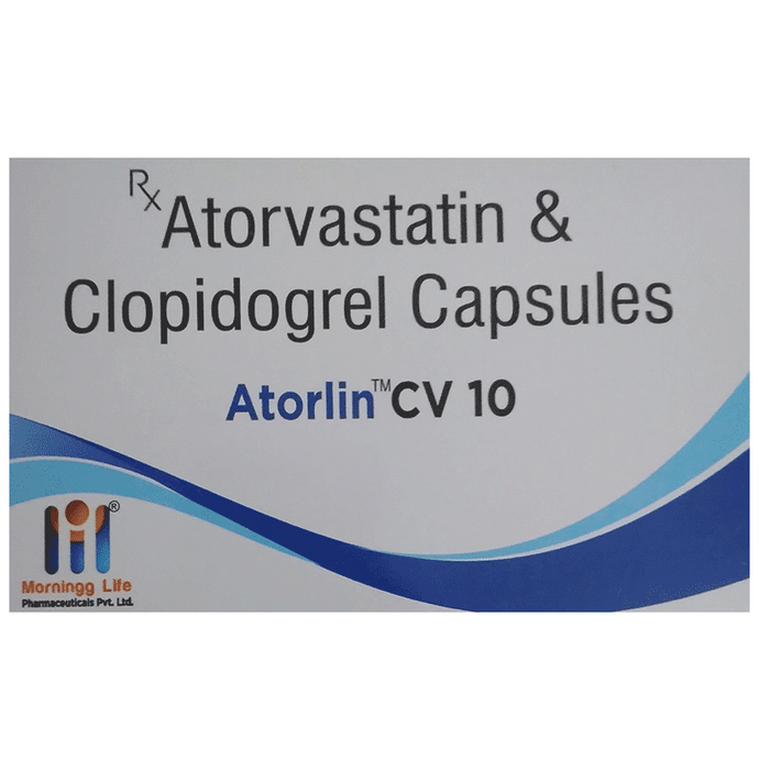 Manufacturer details: Marketer details:Morningg Life Pharmaceuticals Pvt Ltd | 101, Sonam Accord Chs, Building No-8, Phase-11, New Golden Nest, Bhayandar (east) 401105. Mumbai, India, Description:Atorlin CV 10 Capsule is a combination of two medicines used to prevent heart attack and stroke. This medicine reduces the ‘__’bad’__’ cholesterol (LDL) and triglycerides (fats) levels. Moreover, it also decreases the formation of blood clots. Atorlin CV 10 Capsule should be taken with food to avoid stomach upset. You should take it regularly at evenly spaced intervals as per the schedule prescribed by your doctor. Taking it at the same time every day will help you remember to take it. The dose and duration of treatment will depend on what you are being treated for. Do not stop taking it until you have finished the complete course, even when you feel better. Lifestyle changes like low-fat diet, exercise and not smoking may help this medicine to work better.Nausea, abdominal pain, and headache are some common side effects of this medicine. This medicine increases your risk of bleeding, so it is important to be careful while shaving, cutting nails, using sharp objects, or engaging in contact sports (e.g., football, wrestling). Let your doctor know if you notice yellowing of the skin, muscle pain or dark urine.Before taking this medicine, tell your doctor if you have liver or kidney disease or you are suffering from bleeding disorder. You must tell your doctor if you are pregnant, planning pregnancy or breastfeeding. You should also let your healthcare team know all other medicines you are taking as they may affect, or be affected by this medicine.