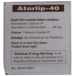 Manufacturer details:                                                                                Marketer details:Cipla Ltd | Cipla House, Peninsula Business Park, Ganpatrao Kadam Marg, Lower Parel, Mumbai-400013,                                                                                                Description:Atorlip 40 Tablet belongs to a group of medicines called statins. It is used to lower cholesterol and to reduce the risk of heart diseases. Cholesterol is a fatty substance that builds up in your blood vessels and causes narrowing, which may lead to a heart attack or stroke. Atorlip 40 Tablet is a widely prescribed medicine and is regarded as safe for long-term use when taken as per the doctor’s advice. It can be taken with a meal or on an empty stomach. You can take it at any time of the day but try to take it at about the same time each day. Most people with high cholesterol do not feel ill, but stopping your medicine may increase your cholesterol levels thereby increasing your risk of heart disease and stroke.It is important to have your cholesterol levels checked regularly. This medicine is only one part of the treatment program which should also include a healthy diet, regular exercise, smoking cessation, moderation of alcohol intake, and weight reduction. You can eat normally while taking this medicine, but try to avoid foods that are high in fat. Common side effects of this medicine include constipation, flatulence, dyspepsia, and abdominal pain. These are usually mild and disappear after a short time. Consult your doctor if they persist or if you notice any yellowing of your eyes or get repeated or unexplained muscle pains. This medicine should not be used in some conditions such as liver disease. Also, pregnant women and breastfeeding mothers should not take this medicine as it may harm the developing baby. Diabetic patients should monitor their blood sugar levels while taking this medicine, as it may lead to an increase in blood sugar levels. Your doctor may check your liver function before starting the treatment and monitor it regularly thereafter.