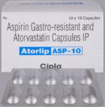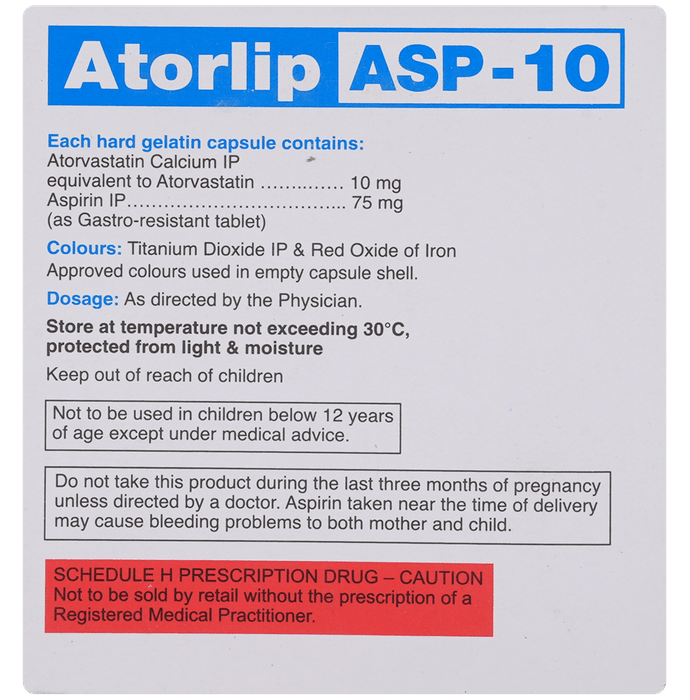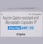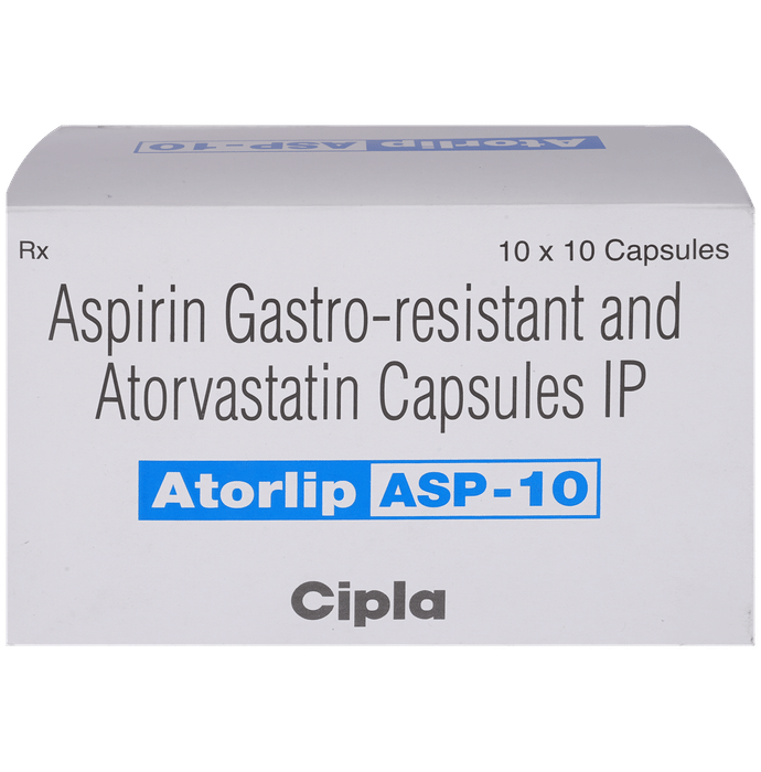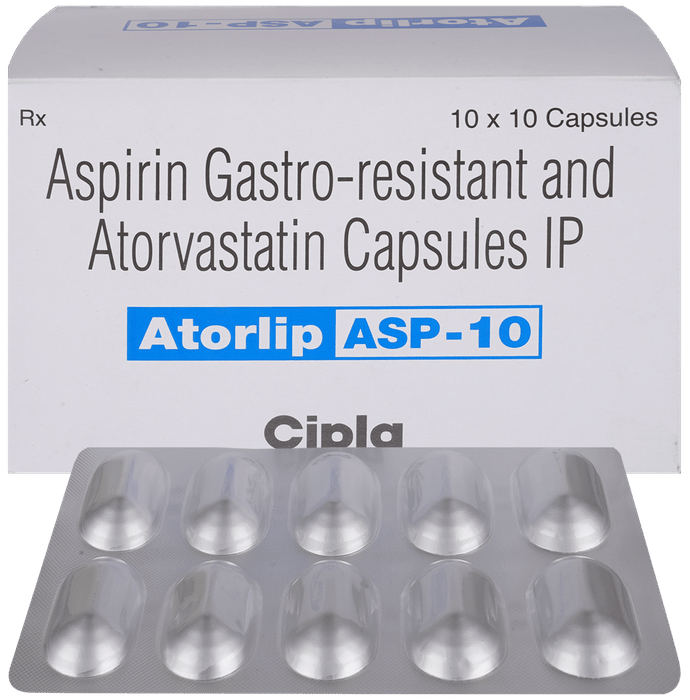 Manufacturer details:                                                                                Marketer details:Cipla Ltd | Cipla House, Peninsula Business Park, Ganpatrao Kadam Marg, Lower Parel, Mumbai-400013,                                                                                                Description:Atorlip-ASP 10 Capsule is a combination of two medicines used to prevent heart attack and stroke. It lowers the ‘__’bad’__’ cholesterol (LDL), triglycerides and raises the ‘__’good’__’ cholesterol (HDL) levels in the body. Moreover, it also decreases the formation of blood clots. Atorlip-ASP 10 Capsule should be taken with food to avoid stomach upset. You should take it regularly at evenly spaced intervals as per the schedule prescribed by your doctor. Taking it at the same time every day will help you remember to take it. The dose and duration of treatment will depend on what you are being treated for. Do not stop taking it until you have finished the complete course, even when you feel better. Lifestyle changes like a low-fat diet, exercise, and not smoking may help this medicine to work better.Abdominal pain, indigestion, constipation, joint pain, and insomnia are some common side effects of this medicine. This medicine increases your risk of bleeding, so it is important to be careful while shaving, cutting nails, using sharp objects, or engaging in contact sports (e.g., football, wrestling). Let your doctor know if you notice yellowing of the skin, muscle pain, or dark urine.Before taking this medicine, tell your doctor if you have liver or kidney disease or you are suffering from a bleeding disorder. You must tell your doctor if you are pregnant, planning pregnancy, or breastfeeding. You should also let your healthcare team know all other medicines you are taking as they may affect, or be affected by this medicine.