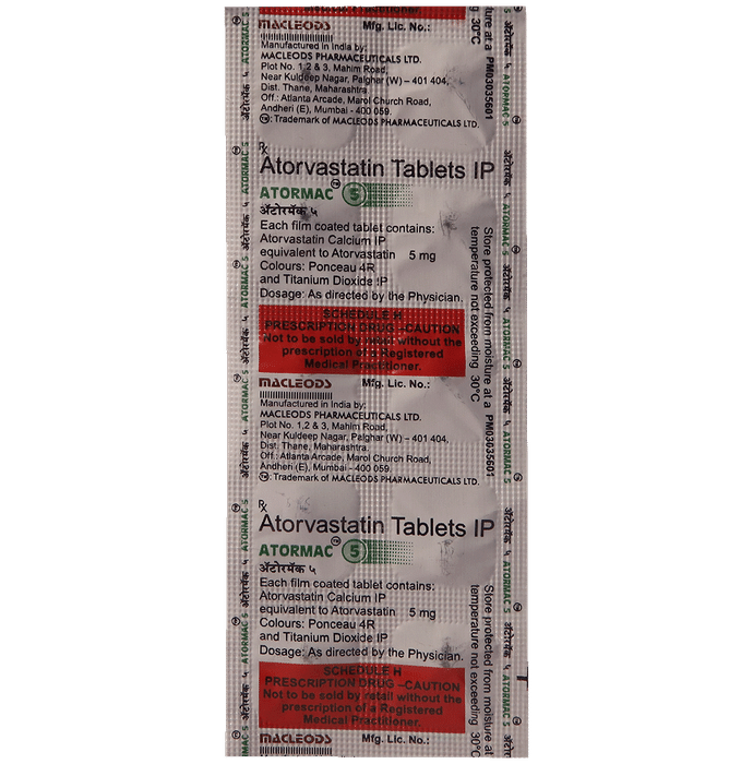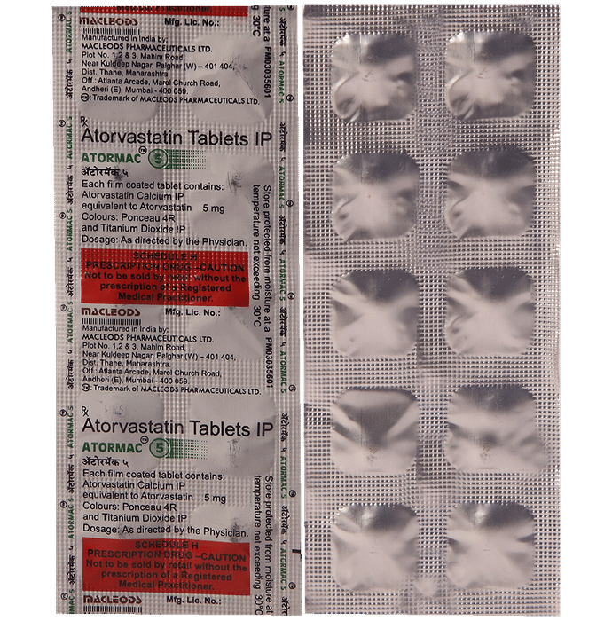 Manufacturer details:                                        Marketer details:Macleods Pharmaceuticals Pvt Ltd | Atlanta Arcade, Marol Church Road, Andheri (East), Mumbai – 400059, INDIA.,                                                Description:Atormac 5 Tablet belongs to a group of medicines called statins. It is used to lower cholesterol and to reduce the risk of heart diseases. Cholesterol is a fatty substance that builds up in your blood vessels and causes narrowing, which may lead to a heart attack or stroke. Atormac 5 Tablet is a widely prescribed medicine and is regarded as safe for long-term use when taken as per the doctor’s advice. It can be taken with a meal or on an empty stomach. You can take it at any time of the day but try to take it at about the same time each day. Most people with high cholesterol do not feel ill, but stopping your medicine may increase your cholesterol levels thereby increasing your risk of heart disease and stroke.It is important to have your cholesterol levels checked regularly. This medicine is only one part of the treatment program which should also include a healthy diet, regular exercise, smoking cessation, moderation of alcohol intake, and weight reduction. You can eat normally while taking this medicine, but try to avoid foods that are high in fat. Common side effects of this medicine include constipation, flatulence, dyspepsia, and abdominal pain. These are usually mild and disappear after a short time. Consult your doctor if they persist or if you notice any yellowing of your eyes or get repeated or unexplained muscle pains. This medicine should not be used in some conditions such as liver disease. Also, pregnant women and breastfeeding mothers should not take this medicine as it may harm the developing baby. Diabetic patients should monitor their blood sugar levels while taking this medicine, as it may lead to an increase in blood sugar levels. Your doctor may check your liver function before starting the treatment and monitor it regularly thereafter.