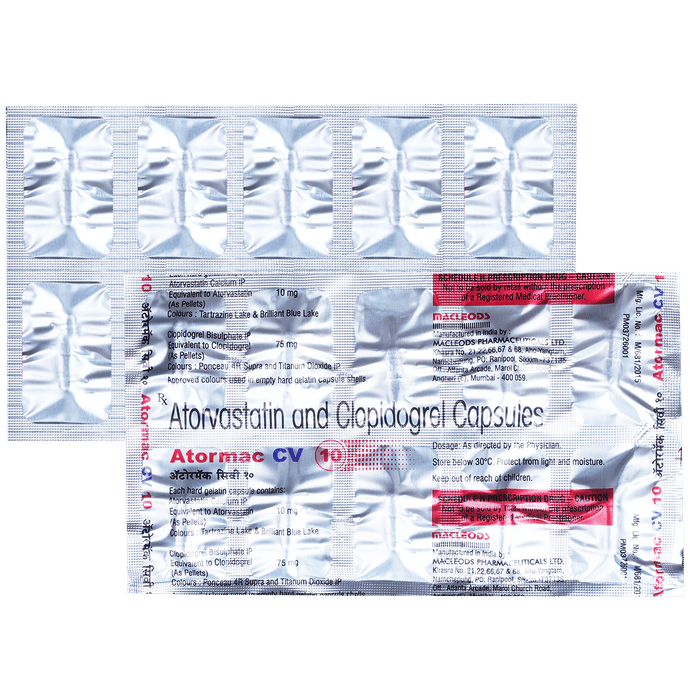 Manufacturer details: Marketer details:Macleods Pharmaceuticals Pvt Ltd | Atlanta Arcade, Marol Church Road, Andheri (East), Mumbai – 400059, INDIA., Description:Atormac CV10 Capsule is a combination of two medicines used to prevent heart attack and stroke. This medicine reduces the ‘__’bad’__’ cholesterol (LDL) and triglycerides (fats) levels. Moreover, it also decreases the formation of blood clots. Atormac CV10 Capsule should be taken with food to avoid stomach upset. You should take it regularly at evenly spaced intervals as per the schedule prescribed by your doctor. Taking it at the same time every day will help you remember to take it. The dose and duration of treatment will depend on what you are being treated for. Do not stop taking it until you have finished the complete course, even when you feel better. Lifestyle changes like low-fat diet, exercise and not smoking may help this medicine to work better.Nausea, abdominal pain, and headache are some common side effects of this medicine. This medicine increases your risk of bleeding, so it is important to be careful while shaving, cutting nails, using sharp objects, or engaging in contact sports (e.g., football, wrestling). Let your doctor know if you notice yellowing of the skin, muscle pain or dark urine.Before taking this medicine, tell your doctor if you have liver or kidney disease or you are suffering from bleeding disorder. You must tell your doctor if you are pregnant, planning pregnancy or breastfeeding. You should also let your healthcare team know all other medicines you are taking as they may affect, or be affected by this medicine.