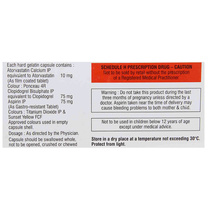 Marketer:Macleods Pharmaceuticals Pvt Ltd,Composition:Aspirin (75mg) + Atorvastatin (10mg) + Clopidogrel (75mg),medicine_type:,