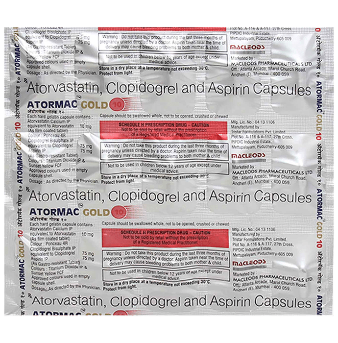 Manufacturer details:                                                                                Marketer details:Macleods Pharmaceuticals Pvt Ltd | Atlanta Arcade, Marol Church Road, Andheri (East), Mumbai – 400059, INDIA.,                                                                                                Description:Atormac Gold 10 Capsule is used for the prevention of heart attack. It is a combination of medicines that prevent clot formation in the blood vessels. It also helps to reduce increased cholesterol and triglycerides levels. Atormac Gold 10 Capsule should be taken with food regularly at a fixed time each day. You should take it regularly at evenly spaced intervals as per the schedule prescribed by your doctor. Taking it at the same time every day will help you remember to take it. The dose and duration of treatment will depend on what you are being treated for. Do not stop taking it until you have finished the complete course, even when you feel better. Lifestyle changes like a low-fat diet, exercise, and not smoking may help this medicine to work better.Abdominal pain, indigestion, bruising, and nosebleeds are some common side effects of this medicine. This medicine increases your risk of bleeding, so it is important to be careful while shaving, cutting nails, and using sharp objects. Let your doctor know if you notice muscle symptoms (pain or weakness), yellowing of the skin, and dark urine. Usually, it is advisable to avoid alcohol intake while taking this medicine.Before taking this medicine, tell your doctor if you have any liver or kidney disease. You must tell your doctor if you are pregnant, planning pregnancy, or breastfeeding. You should also let your healthcare team know all other medicines you are taking as they may affect, or be affected by this medicine.