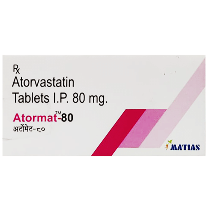 Manufacturer details:                                        Marketer details:Matias Healthcare Pvt Ltd | 101-104 GCP Business centre opp. Memnagar fire station Vijay cross road Memnagar Ahmedabad-380014 India,                                                Description:Atormat 80 Tablet belongs to a group of medicines called statins. It is used to lower cholesterol and to reduce the risk of heart diseases. Cholesterol is a fatty substance that builds up in your blood vessels and causes narrowing, which may lead to a heart attack or stroke. Atormat 80 Tablet is a widely prescribed medicine and is regarded as safe for long-term use when taken as per the doctor’s advice. It can be taken with a meal or on an empty stomach. You can take it at any time of the day but try to take it at about the same time each day. Most people with high cholesterol do not feel ill, but stopping your medicine may increase your cholesterol levels thereby increasing your risk of heart disease and stroke.It is important to have your cholesterol levels checked regularly. This medicine is only one part of the treatment program which should also include a healthy diet, regular exercise, smoking cessation, moderation of alcohol intake, and weight reduction. You can eat normally while taking this medicine, but try to avoid foods that are high in fat. Common side effects of this medicine include constipation, flatulence, dyspepsia, and abdominal pain. These are usually mild and disappear after a short time. Consult your doctor if they persist or if you notice any yellowing of your eyes or get repeated or unexplained muscle pains. This medicine should not be used in some conditions such as liver disease. Also, pregnant women and breastfeeding mothers should not take this medicine as it may harm the developing baby. Diabetic patients should monitor their blood sugar levels while taking this medicine, as it may lead to an increase in blood sugar levels. Your doctor may check your liver function before starting the treatment and monitor it regularly thereafter.