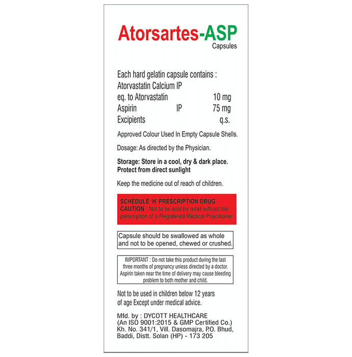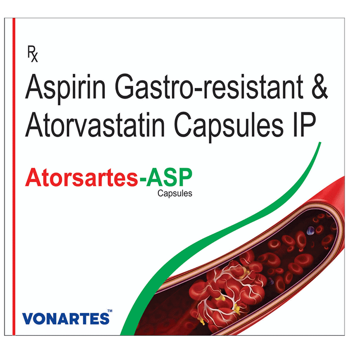 Manufacturer details: Marketer details:Vonartes Pharmaceutical LLP | Shop NO. – 117, Pushkar Estate – 2, Opp. National Rifle Phase – 1, GIDC, Vatva, Ahmedabad – 382450, Description:Atorsartes-ASP Capsule is a combination of two medicines used to prevent heart attack and stroke. It lowers the ‘__’bad’__’ cholesterol (LDL), triglycerides and raises the ‘__’good’__’ cholesterol (HDL) levels in the body. Moreover, it also decreases the formation of blood clots. Atorsartes-ASP Capsule should be taken with food to avoid stomach upset. You should take it regularly at evenly spaced intervals as per the schedule prescribed by your doctor. Taking it at the same time every day will help you remember to take it. The dose and duration of treatment will depend on what you are being treated for. Do not stop taking it until you have finished the complete course, even when you feel better. Lifestyle changes like a low-fat diet, exercise, and not smoking may help this medicine to work better.Abdominal pain, indigestion, constipation, joint pain, and insomnia are some common side effects of this medicine. This medicine increases your risk of bleeding, so it is important to be careful while shaving, cutting nails, using sharp objects, or engaging in contact sports (e.g., football, wrestling). Let your doctor know if you notice yellowing of the skin, muscle pain, or dark urine.Before taking this medicine, tell your doctor if you have liver or kidney disease or you are suffering from a bleeding disorder. You must tell your doctor if you are pregnant, planning pregnancy, or breastfeeding. You should also let your healthcare team know all other medicines you are taking as they may affect, or be affected by this medicine.