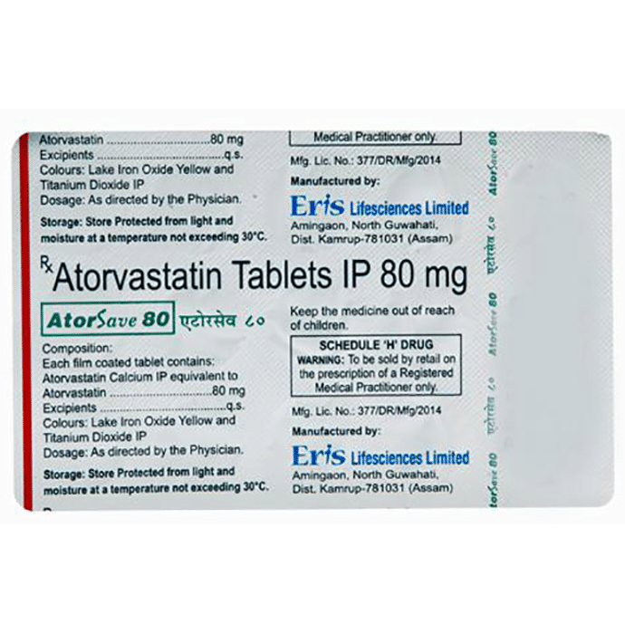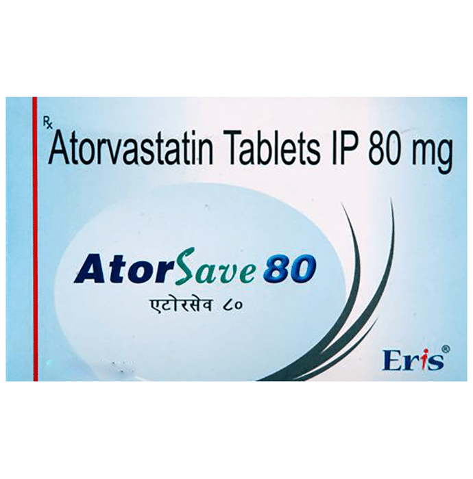 Manufacturer details:                                        Marketer details:Eris Lifesciences Ltd | 8th Floor, Commerce House IV, Prahladnagar, Ahmedabad – 380015 Gujarat, India,                                                Description:Atorsave 80 Tablet belongs to a group of medicines called statins. It is used to lower cholesterol and to reduce the risk of heart diseases. Cholesterol is a fatty substance that builds up in your blood vessels and causes narrowing, which may lead to a heart attack or stroke. Atorsave 80 Tablet is a widely prescribed medicine and is regarded as safe for long-term use when taken as per the doctor’s advice. It can be taken with a meal or on an empty stomach. You can take it at any time of the day but try to take it at about the same time each day. Most people with high cholesterol do not feel ill, but stopping your medicine may increase your cholesterol levels thereby increasing your risk of heart disease and stroke.It is important to have your cholesterol levels checked regularly. This medicine is only one part of the treatment program which should also include a healthy diet, regular exercise, smoking cessation, moderation of alcohol intake, and weight reduction. You can eat normally while taking this medicine, but try to avoid foods that are high in fat. Common side effects of this medicine include constipation, flatulence, dyspepsia, and abdominal pain. These are usually mild and disappear after a short time. Consult your doctor if they persist or if you notice any yellowing of your eyes or get repeated or unexplained muscle pains. This medicine should not be used in some conditions such as liver disease. Also, pregnant women and breastfeeding mothers should not take this medicine as it may harm the developing baby. Diabetic patients should monitor their blood sugar levels while taking this medicine, as it may lead to an increase in blood sugar levels. Your doctor may check your liver function before starting the treatment and monitor it regularly thereafter.