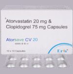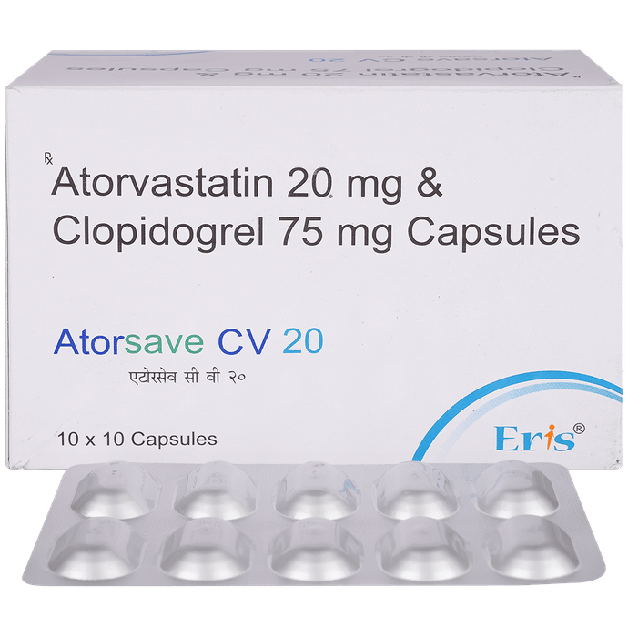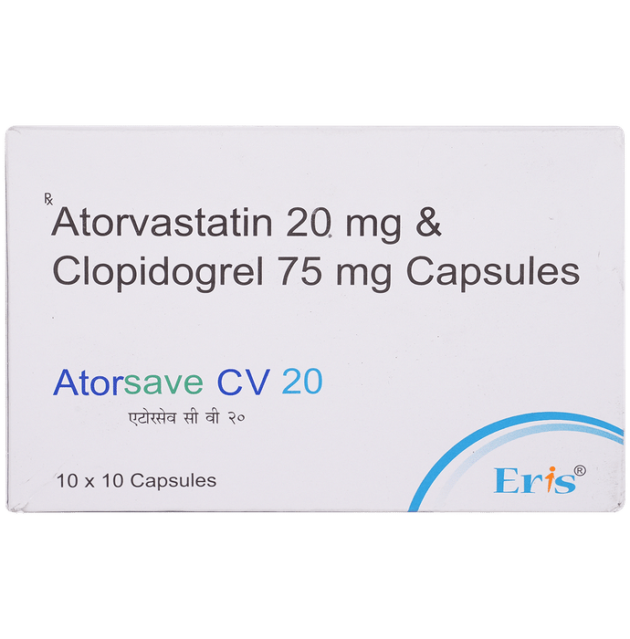 Manufacturer details: Marketer details:Eris Lifesciences Ltd | 8th Floor, Commerce House IV, Prahladnagar, Ahmedabad – 380015 Gujarat, India, Description:Atorsave CV 20 Capsule is a combination of two medicines used to prevent heart attack and stroke. This medicine reduces the ‘__’bad’__’ cholesterol (LDL) and triglycerides (fats) levels. Moreover, it also decreases the formation of blood clots. Atorsave CV 20 Capsule should be taken with food to avoid stomach upset. You should take it regularly at evenly spaced intervals as per the schedule prescribed by your doctor. Taking it at the same time every day will help you remember to take it. The dose and duration of treatment will depend on what you are being treated for. Do not stop taking it until you have finished the complete course, even when you feel better. Lifestyle changes like low-fat diet, exercise and not smoking may help this medicine to work better.Nausea, abdominal pain, and headache are some common side effects of this medicine. This medicine increases your risk of bleeding, so it is important to be careful while shaving, cutting nails, using sharp objects, or engaging in contact sports (e.g., football, wrestling). Let your doctor know if you notice yellowing of the skin, muscle pain or dark urine.Before taking this medicine, tell your doctor if you have liver or kidney disease or you are suffering from bleeding disorder. You must tell your doctor if you are pregnant, planning pregnancy or breastfeeding. You should also let your healthcare team know all other medicines you are taking as they may affect, or be affected by this medicine.