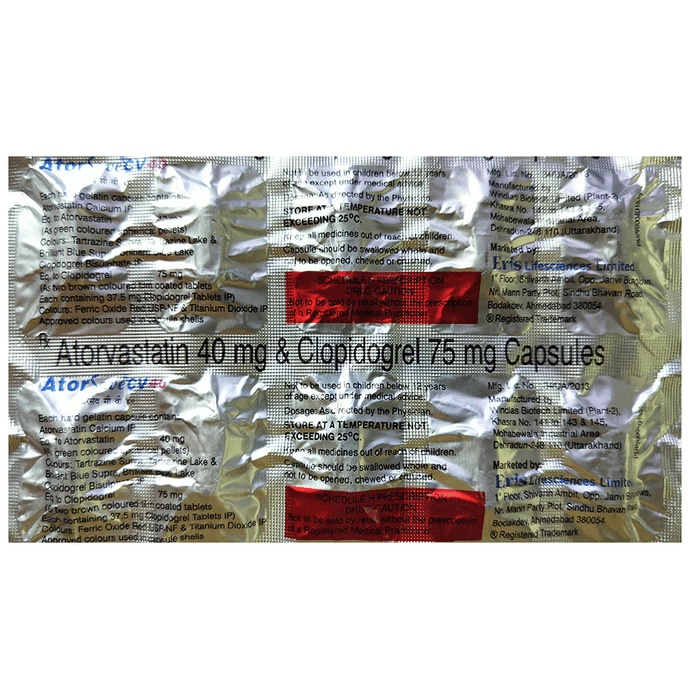 Manufacturer details:                                                                                Marketer details:Eris Lifesciences Ltd | 8th Floor, Commerce House IV, Prahladnagar, Ahmedabad – 380015 Gujarat, India,                                                                                                Description:Atorsave CV 40mg/75mg Capsule is a combination of two medicines used to prevent heart attack and stroke. This medicine reduces the ‘__’bad’__’ cholesterol (LDL) and triglycerides (fats) levels. Moreover, it also decreases the formation of blood clots. Atorsave CV 40mg/75mg Capsule should be taken with food to avoid stomach upset. You should take it regularly at evenly spaced intervals as per the schedule prescribed by your doctor. Taking it at the same time every day will help you remember to take it. The dose and duration of treatment will depend on what you are being treated for. Do not stop taking it until you have finished the complete course, even when you feel better. Lifestyle changes like low-fat diet, exercise and not smoking may help this medicine to work better.Nausea, abdominal pain, and headache are some common side effects of this medicine. This medicine increases your risk of bleeding, so it is important to be careful while shaving, cutting nails, using sharp objects, or engaging in contact sports (e.g., football, wrestling). Let your doctor know if you notice yellowing of the skin, muscle pain or dark urine.Before taking this medicine, tell your doctor if you have liver or kidney disease or you are suffering from bleeding disorder. You must tell your doctor if you are pregnant, planning pregnancy or breastfeeding. You should also let your healthcare team know all other medicines you are taking as they may affect, or be affected by this medicine.