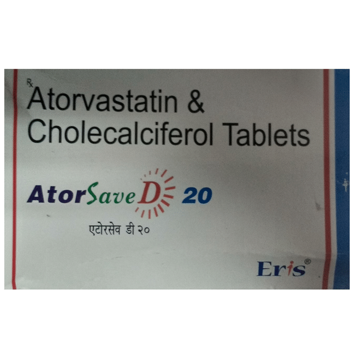 Manufacturer details:                                        Marketer details:Eris Lifesciences Ltd | 8th Floor, Commerce House IV, Prahladnagar, Ahmedabad – 380015 Gujarat, India,                                                Description:Atorsave D 20 Tablet is a medicine used to treat high cholesterol. It is a combination of two medicines that reduces ‘__’bad’__’ cholesterol (LDL) and triglycerides (fats) levels in the body. It may also reduce the risk of future heart attack and stroke. Atorsave D 20 Tablet should be taken with food to avoid stomach upset. You should take it regularly at evenly spaced intervals as per the schedule prescribed by your doctor. Taking it at the same time every day will help you remember to take it. The dose and duration of treatment will depend on what you are being treated for. Do not stop taking it until you have finished the complete course, even when you feel better. Lifestyle changes like low-fat diet, exercise and not smoking may help this medicine to work better.Nausea, stomach pain, constipation, and muscle weakness are some common side effects of this medicine. It decreases the amount of calcium in your blood, so have regular blood tests to monitor the level of calcium. Let your doctor know if you notice yellowing of skin, muscle pain or dark urine. You may be asked for regular monitoring of liver function or blood sugar level while taking this medicine.Before taking this medicine, tell your doctor if you are pregnant, planning pregnancy or breastfeeding. You should also let your healthcare team know all other medicines you are taking as they may affect, or be affected by this medicine.