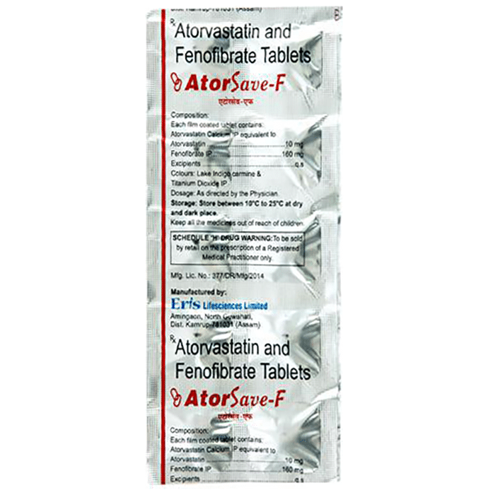 Manufacturer details:                                        Marketer details:Eris Lifesciences Ltd | 8th Floor, Commerce House IV, Prahladnagar, Ahmedabad – 380015 Gujarat, India,                                                Description:Atorsave F Tablet is a combination of two lipids (fat) lowering medicines. It is used to lower the levels of lipids known as cholesterol and triglycerides in the blood when lifestyle changes (eg. low-fat diet) on their own have failed. This medicine helps to reduce the risk of heart disease. Atorsave F Tablet can be taken with a meal or on an empty stomach. You can take it at any time of the day but try to take it at the same time each day. This will help you remember to take it. Your doctor will prescribe the right dose depending on your lipid levels and how you respond to this medicine. Most people with high cholesterol and triglyceride do not feel ill, but stopping your medicine may increase your lipid levels, making your condition worse and increasing your risk of heart disease and stroke.It is important to have your cholesterol and triglyceride levels (lipid profile) checked regularly. This medicine is only one part of a treatment program which should also include a healthy low-fat diet, regular exercise, smoking cessation, moderation of alcohol intake, and weight reduction. You can eat normally while taking this medicine, but try to avoid foods that are high in fat.Nausea, stomach pain, diarrhea, constipation, headache, insomnia, flatulence (excessive gas), and muscle pain are some of the common side effects of this medicine. These are usually mild and disappear after a short time. Consult your doctor if they persist or if you notice any yellowing of your eyes, unusual bleeding or bruising, or get repeated, severe, or unexplained muscle pains. You may be advised to get your liver function tested periodically while taking this medicine.This medicine should not be used in conditions such as liver disease (eg. abnormal blood tests for liver function, persistent yellowness of eyes, etc.). Before taking it, let your doctor know if you have any kidney-related problems or if you are pregnant, planning a pregnancy, or breastfeeding. Diabetic patients should monitor their blood sugar levels while taking this medicine, as it may lead to an increase in blood sugar levels.