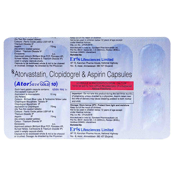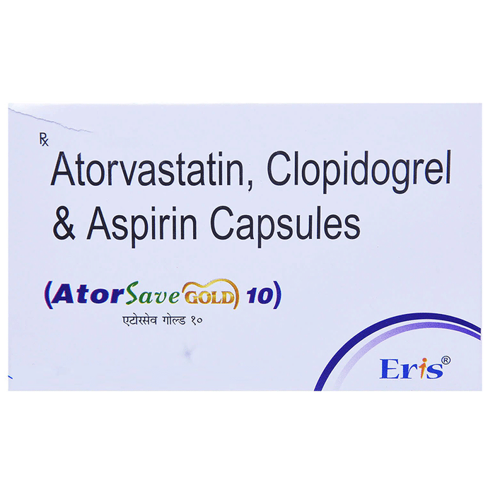 Manufacturer details: Marketer details:Eris Lifesciences Ltd | 8th Floor, Commerce House IV, Prahladnagar, Ahmedabad – 380015 Gujarat, India, Description:Atorsave Gold 75mg/10mg/75mg Capsule is used for the prevention of heart attack. It is a combination of medicines that prevent clot formation in the blood vessels. It also helps to reduce increased cholesterol and triglycerides levels. Atorsave Gold 75mg/10mg/75mg Capsule should be taken with food regularly at a fixed time each day. You should take it regularly at evenly spaced intervals as per the schedule prescribed by your doctor. Taking it at the same time every day will help you remember to take it. The dose and duration of treatment will depend on what you are being treated for. Do not stop taking it until you have finished the complete course, even when you feel better. Lifestyle changes like a low-fat diet, exercise, and not smoking may help this medicine to work better.Abdominal pain, indigestion, bruising, and nosebleeds are some common side effects of this medicine. This medicine increases your risk of bleeding, so it is important to be careful while shaving, cutting nails, and using sharp objects. Let your doctor know if you notice muscle symptoms (pain or weakness), yellowing of the skin, and dark urine. Usually, it is advisable to avoid alcohol intake while taking this medicine.Before taking this medicine, tell your doctor if you have any liver or kidney disease. You must tell your doctor if you are pregnant, planning pregnancy, or breastfeeding. You should also let your healthcare team know all other medicines you are taking as they may affect, or be affected by this medicine.