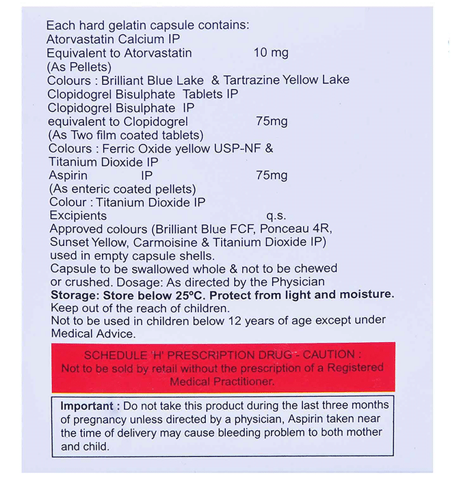 Marketer:Eris Lifesciences Ltd,Composition:Aspirin (75mg) + Atorvastatin (10mg) + Clopidogrel (75mg),medicine_type:,