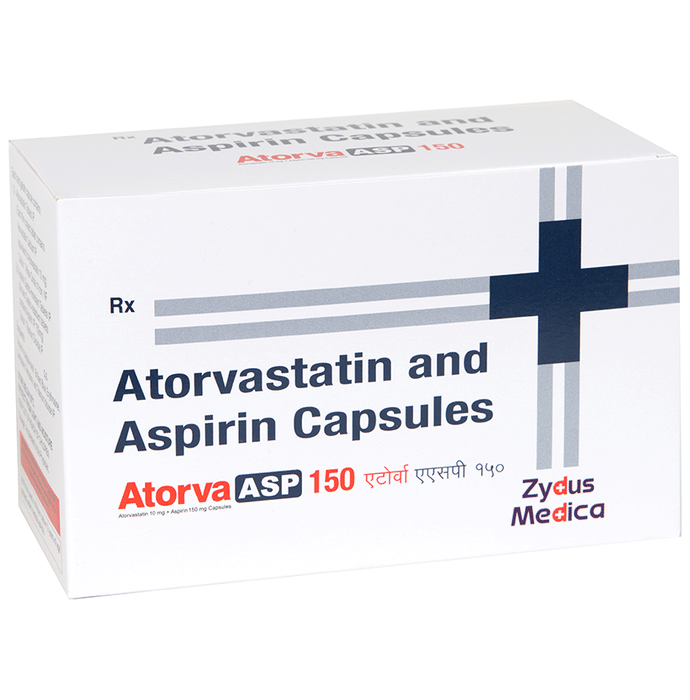 Manufacturer details: Marketer details:Zydus Cadila | Zydus Tower, Satellite Cross Roads,Ahmedabad – 380015 Gujarat, India., Description:Atorva Asp 150 Capsule is a combination of two medicines used to prevent heart attack and stroke. It lowers the ‘__’bad’__’ cholesterol (LDL), triglycerides and raises the ‘__’good’__’ cholesterol (HDL) levels in the body. Moreover, it also decreases the formation of blood clots. Atorva Asp 150 Capsule should be taken with food to avoid stomach upset. You should take it regularly at evenly spaced intervals as per the schedule prescribed by your doctor. Taking it at the same time every day will help you remember to take it. The dose and duration of treatment will depend on what you are being treated for. Do not stop taking it until you have finished the complete course, even when you feel better. Lifestyle changes like a low-fat diet, exercise, and not smoking may help this medicine to work better.Abdominal pain, indigestion, constipation, joint pain, and insomnia are some common side effects of this medicine. This medicine increases your risk of bleeding, so it is important to be careful while shaving, cutting nails, using sharp objects, or engaging in contact sports (e.g., football, wrestling). Let your doctor know if you notice yellowing of the skin, muscle pain, or dark urine.Before taking this medicine, tell your doctor if you have liver or kidney disease or you are suffering from a bleeding disorder. You must tell your doctor if you are pregnant, planning pregnancy, or breastfeeding. You should also let your healthcare team know all other medicines you are taking as they may affect, or be affected by this medicine.