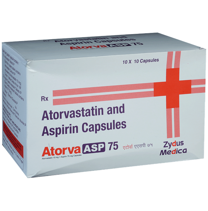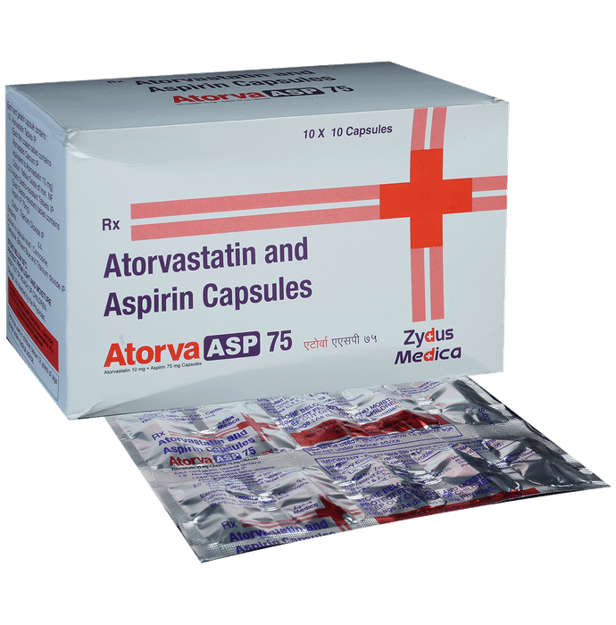 Manufacturer details:                                                                                Marketer details:Zydus Cadila | Zydus Tower, Satellite Cross Roads,Ahmedabad – 380015 Gujarat, India.,                                                                                                Description:Atorva Asp 75 Capsule is a combination of two medicines used to prevent heart attack and stroke. It lowers the ‘__’bad’__’ cholesterol (LDL), triglycerides and raises the ‘__’good’__’ cholesterol (HDL) levels in the body. Moreover, it also decreases the formation of blood clots. Atorva Asp 75 Capsule should be taken with food to avoid stomach upset. You should take it regularly at evenly spaced intervals as per the schedule prescribed by your doctor. Taking it at the same time every day will help you remember to take it. The dose and duration of treatment will depend on what you are being treated for. Do not stop taking it until you have finished the complete course, even when you feel better. Lifestyle changes like a low-fat diet, exercise, and not smoking may help this medicine to work better.Abdominal pain, indigestion, constipation, joint pain, and insomnia are some common side effects of this medicine. This medicine increases your risk of bleeding, so it is important to be careful while shaving, cutting nails, using sharp objects, or engaging in contact sports (e.g., football, wrestling). Let your doctor know if you notice yellowing of the skin, muscle pain, or dark urine.Before taking this medicine, tell your doctor if you have liver or kidney disease or you are suffering from a bleeding disorder. You must tell your doctor if you are pregnant, planning pregnancy, or breastfeeding. You should also let your healthcare team know all other medicines you are taking as they may affect, or be affected by this medicine.