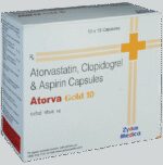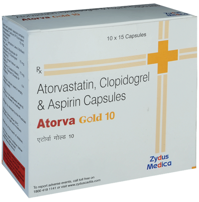 Manufacturer details:                                                                                Marketer details:Zydus Cadila | Zydus Tower, Satellite Cross Roads,Ahmedabad – 380015 Gujarat, India.,                                                                                                Description:Atorva Gold 10 Capsule is used for the prevention of heart attack. It is a combination of medicines that prevent clot formation in the blood vessels. It also helps to reduce increased cholesterol and triglycerides levels. Atorva Gold 10 Capsule should be taken with food regularly at a fixed time each day. You should take it regularly at evenly spaced intervals as per the schedule prescribed by your doctor. Taking it at the same time every day will help you remember to take it. The dose and duration of treatment will depend on what you are being treated for. Do not stop taking it until you have finished the complete course, even when you feel better. Lifestyle changes like a low-fat diet, exercise, and not smoking may help this medicine to work better.Abdominal pain, indigestion, bruising, and nosebleeds are some common side effects of this medicine. This medicine increases your risk of bleeding, so it is important to be careful while shaving, cutting nails, and using sharp objects. Let your doctor know if you notice muscle symptoms (pain or weakness), yellowing of the skin, and dark urine. Usually, it is advisable to avoid alcohol intake while taking this medicine.Before taking this medicine, tell your doctor if you have any liver or kidney disease. You must tell your doctor if you are pregnant, planning pregnancy, or breastfeeding. You should also let your healthcare team know all other medicines you are taking as they may affect, or be affected by this medicine.