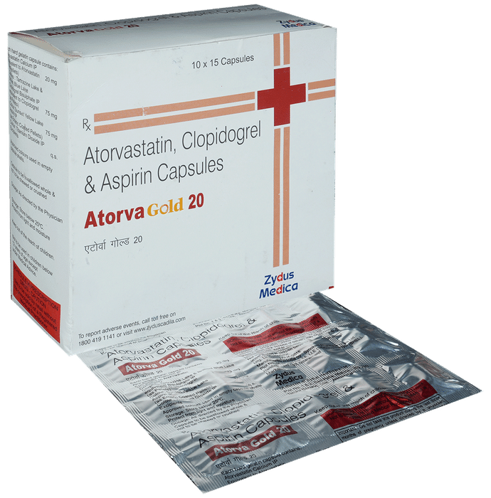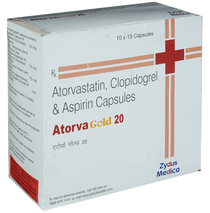 Manufacturer details: Marketer details:Zydus Cadila | Zydus Tower, Satellite Cross Roads,Ahmedabad – 380015 Gujarat, India., Description:Atorva Gold 20 Capsule is used for the prevention of heart attack. It is a combination of medicines that prevent clot formation in the blood vessels. It also helps to reduce increased cholesterol and triglycerides levels. Atorva Gold 20 Capsule should be taken with food regularly at a fixed time each day. You should take it regularly at evenly spaced intervals as per the schedule prescribed by your doctor. Taking it at the same time every day will help you remember to take it. The dose and duration of treatment will depend on what you are being treated for. Do not stop taking it until you have finished the complete course, even when you feel better. Lifestyle changes like a low-fat diet, exercise, and not smoking may help this medicine to work better.Abdominal pain, indigestion, bruising, and nosebleeds are some common side effects of this medicine. This medicine increases your risk of bleeding, so it is important to be careful while shaving, cutting nails, and using sharp objects. Let your doctor know if you notice muscle symptoms (pain or weakness), yellowing of the skin, and dark urine. Usually, it is advisable to avoid alcohol intake while taking this medicine.Before taking this medicine, tell your doctor if you have any liver or kidney disease. You must tell your doctor if you are pregnant, planning pregnancy, or breastfeeding. You should also let your healthcare team know all other medicines you are taking as they may affect, or be affected by this medicine.