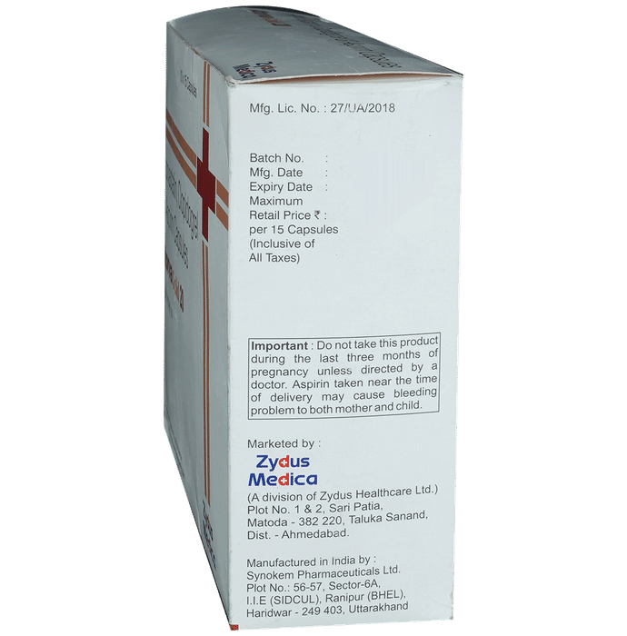 Package:Strip,Qty:15,Product Form:Capsule ,prescription_required:Prescription Required,Fact_Box:Habit Forming :: No|Therapeutic Class :: CARDIAC, primary_use:Prevention of Heart attack,storage:Store below 30°C, common_side_effect:Increased bleeding tendency | Abdominal pain | Indigestion | Bruise | Nosebleeds | Gastrointestinal bleeding | Diarrhea, MANUFACTURER_ADDRESS:Zydus Tower, Satellite Cross Roads,Ahmedabad – 380015 Gujarat, India., country_of_origin:India,Q_A:</q_a>, How it works:,