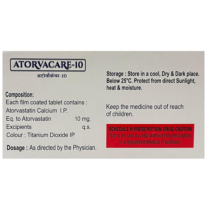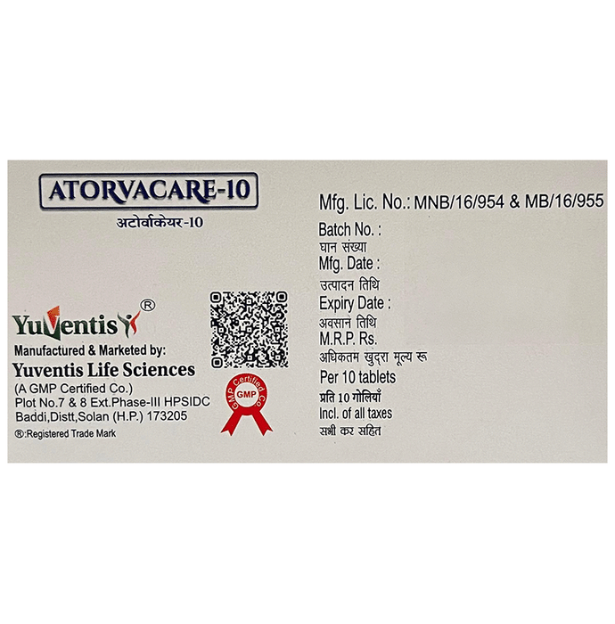 Manufacturer details:                                        Marketer details:Yuventis Pharmaceuticals | Ground floor, plot no 451 ind.aera, phase 1 Panchkula (Haryana),                                                Description:Atorvacare 10mg Tablet belongs to a group of medicines called statins. It is used to lower cholesterol and to reduce the risk of heart diseases. Cholesterol is a fatty substance that builds up in your blood vessels and causes narrowing, which may lead to a heart attack or stroke. Atorvacare 10mg Tablet is a widely prescribed medicine and is regarded as safe for long-term use when taken as per the doctor’s advice. It can be taken with a meal or on an empty stomach. You can take it at any time of the day but try to take it at about the same time each day. Most people with high cholesterol do not feel ill, but stopping your medicine may increase your cholesterol levels thereby increasing your risk of heart disease and stroke.It is important to have your cholesterol levels checked regularly. This medicine is only one part of the treatment program which should also include a healthy diet, regular exercise, smoking cessation, moderation of alcohol intake, and weight reduction. You can eat normally while taking this medicine, but try to avoid foods that are high in fat. Common side effects of this medicine include constipation, flatulence, dyspepsia, and abdominal pain. These are usually mild and disappear after a short time. Consult your doctor if they persist or if you notice any yellowing of your eyes or get repeated or unexplained muscle pains. This medicine should not be used in some conditions such as liver disease. Also, pregnant women and breastfeeding mothers should not take this medicine as it may harm the developing baby. Diabetic patients should monitor their blood sugar levels while taking this medicine, as it may lead to an increase in blood sugar levels. Your doctor may check your liver function before starting the treatment and monitor it regularly thereafter.