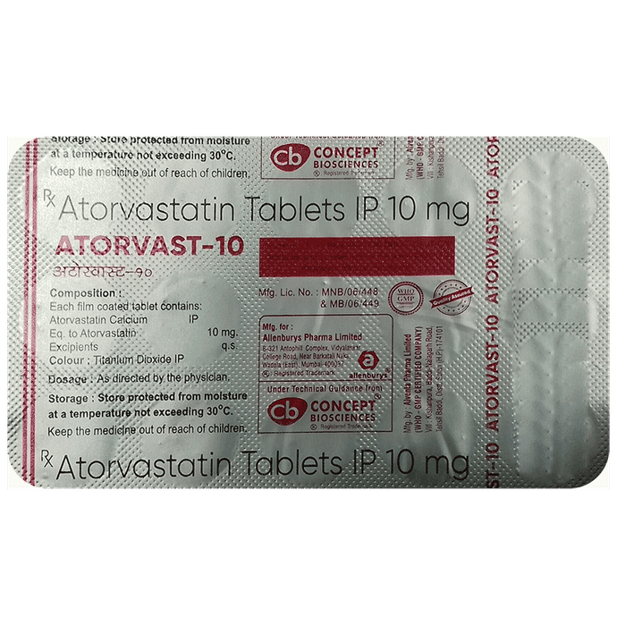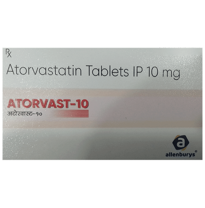 Manufacturer details:                                                                                Marketer details:Allenburys Pharma Limited | BASEMENT, HADBAST NO. 234, KHATAN NO. 698/818, KHASRA NO. 18/20, 21,22/1, GODOWN AREA, NEAR VIVEKANANDA SCHOOL, VILLAGE- PABHAT, ZIRAKPUR, SAS NAGAR, PUNJAB- 140603,                                                                                                Description:Atorvast 10 Tablet belongs to a group of medicines called statins. It is used to lower cholesterol and to reduce the risk of heart diseases. Cholesterol is a fatty substance that builds up in your blood vessels and causes narrowing, which may lead to a heart attack or stroke. Atorvast 10 Tablet is a widely prescribed medicine and is regarded as safe for long-term use when taken as per the doctor’s advice. It can be taken with a meal or on an empty stomach. You can take it at any time of the day but try to take it at about the same time each day. Most people with high cholesterol do not feel ill, but stopping your medicine may increase your cholesterol levels thereby increasing your risk of heart disease and stroke.It is important to have your cholesterol levels checked regularly. This medicine is only one part of the treatment program which should also include a healthy diet, regular exercise, smoking cessation, moderation of alcohol intake, and weight reduction. You can eat normally while taking this medicine, but try to avoid foods that are high in fat. Common side effects of this medicine include constipation, flatulence, dyspepsia, and abdominal pain. These are usually mild and disappear after a short time. Consult your doctor if they persist or if you notice any yellowing of your eyes or get repeated or unexplained muscle pains. This medicine should not be used in some conditions such as liver disease. Also, pregnant women and breastfeeding mothers should not take this medicine as it may harm the developing baby. Diabetic patients should monitor their blood sugar levels while taking this medicine, as it may lead to an increase in blood sugar levels. Your doctor may check your liver function before starting the treatment and monitor it regularly thereafter.