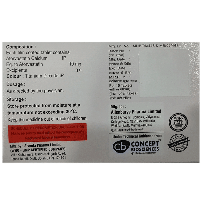 Marketer:Allenburys Pharma Limited,Composition:Atorvastatin (10mg),medicine_type:,