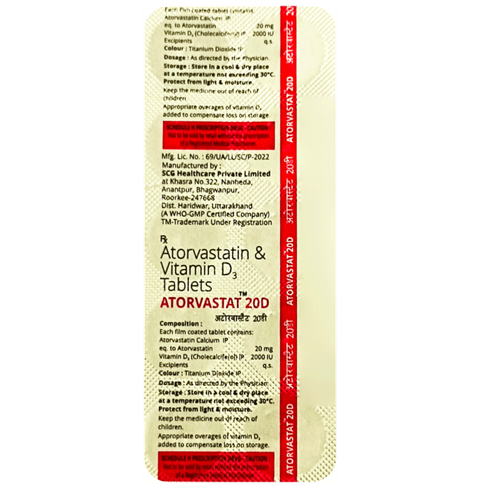Manufacturer details:                                        Marketer details:SCG Healthcare Private Limited | Office No 412, Eros Square City Sector 49-50, Gurgaon, Haryana 9810550906,                                                Description:Atorvastat 20D Tablet is a medicine used to treat high cholesterol. It is a combination of two medicines that reduces ‘__’bad’__’ cholesterol (LDL) and triglycerides (fats) levels in the body. It may also reduce the risk of future heart attack and stroke. Atorvastat 20D Tablet should be taken with food to avoid stomach upset. You should take it regularly at evenly spaced intervals as per the schedule prescribed by your doctor. Taking it at the same time every day will help you remember to take it. The dose and duration of treatment will depend on what you are being treated for. Do not stop taking it until you have finished the complete course, even when you feel better. Lifestyle changes like low-fat diet, exercise and not smoking may help this medicine to work better.Nausea, stomach pain, constipation, and muscle weakness are some common side effects of this medicine. It decreases the amount of calcium in your blood, so have regular blood tests to monitor the level of calcium. Let your doctor know if you notice yellowing of skin, muscle pain or dark urine. You may be asked for regular monitoring of liver function or blood sugar level while taking this medicine.Before taking this medicine, tell your doctor if you are pregnant, planning pregnancy or breastfeeding. You should also let your healthcare team know all other medicines you are taking as they may affect, or be affected by this medicine.