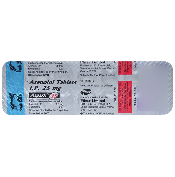 Manufacturer details:                                        Marketer details:Pfizer Ltd | The Capital, 1802, 18th Floor , Plot No. C-70, ‘G’ Block , Bandra Kurla Complex, Bandra East , Mumbai – 400051.,                                                Description:Atpark 25 Tablet belongs to a group of medicines called beta-blockers. It is used to treat high blood pressure (hypertension), angina (heart-related chest pain), irregular heart rhythms (arrhythmia). It also helps to prevent future heart attacks and stroke. Atpark 25 Tablet may be prescribed alone or together with other medications. The dose and frequency depend on what you are taking it for and the severity of your condition. It may be taken empty stomach or with a meal, but take it regularly at the same time each day to get the most benefit. It may take several weeks before you get the full benefit of this medicine and you may need to take it for the rest of your life. However, it is important to continue taking it even if you feel well. Most people with high blood pressure do not feel ill and if you stop taking it, your condition may worsen.The main side effects of this medicine are fatigue, slow heart rate, feeling dizzy, diarrhea, and nausea. These are usually mild and short-lived. It may also cause shortness of breath or low blood pressure in some people. To reduce the risk of side effects your doctor will probably start the medicine at a low dose and gradually increase it. Consult your doctor if the side effects bother you or do not go away.Before taking it, let your doctor know if you have any liver problems. It may also not be suitable for people who have a slow heart rate, severe circulation problems, severe heart failure, or low blood pressure. Pregnant or breastfeeding mothers should also consult their doctor before taking it. You must talk to your doctor to find out whether this medicine is suitable for you to use. You should have your blood pressure checked regularly to make sure that this medicine is working properly. Avoid drinking alcohol as it may increase certain side effects.