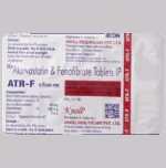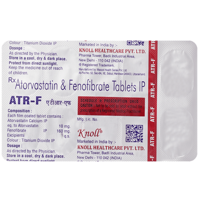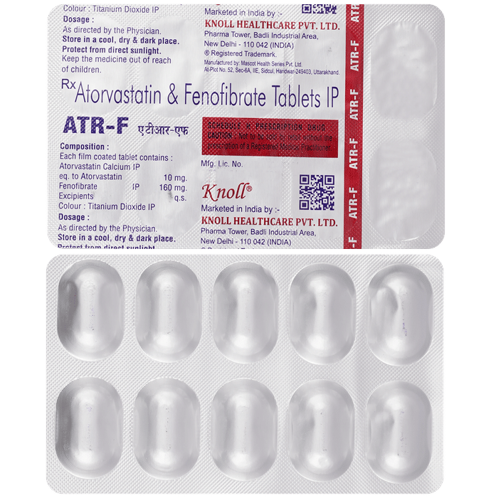 Manufacturer details:                                        Marketer details:Knoll Pharmaceuticals Ltd | M-17, Pharma Tower, Basement & Ground Floor, Badli Industrial Area, New Delhi 110 042,                                                Description:ATR-F Tablet is a combination of two lipids (fat) lowering medicines. It is used to lower the levels of lipids known as cholesterol and triglycerides in the blood when lifestyle changes (eg. low-fat diet) on their own have failed. This medicine helps to reduce the risk of heart disease. ATR-F Tablet can be taken with a meal or on an empty stomach. You can take it at any time of the day but try to take it at the same time each day. This will help you remember to take it. Your doctor will prescribe the right dose depending on your lipid levels and how you respond to this medicine. Most people with high cholesterol and triglyceride do not feel ill, but stopping your medicine may increase your lipid levels, making your condition worse and increasing your risk of heart disease and stroke.It is important to have your cholesterol and triglyceride levels (lipid profile) checked regularly. This medicine is only one part of a treatment program which should also include a healthy low-fat diet, regular exercise, smoking cessation, moderation of alcohol intake, and weight reduction. You can eat normally while taking this medicine, but try to avoid foods that are high in fat.Nausea, stomach pain, diarrhea, constipation, headache, insomnia, flatulence (excessive gas), and muscle pain are some of the common side effects of this medicine. These are usually mild and disappear after a short time. Consult your doctor if they persist or if you notice any yellowing of your eyes, unusual bleeding or bruising, or get repeated, severe, or unexplained muscle pains. You may be advised to get your liver function tested periodically while taking this medicine.This medicine should not be used in conditions such as liver disease (eg. abnormal blood tests for liver function, persistent yellowness of eyes, etc.). Before taking it, let your doctor know if you have any kidney-related problems or if you are pregnant, planning a pregnancy, or breastfeeding. Diabetic patients should monitor their blood sugar levels while taking this medicine, as it may lead to an increase in blood sugar levels.