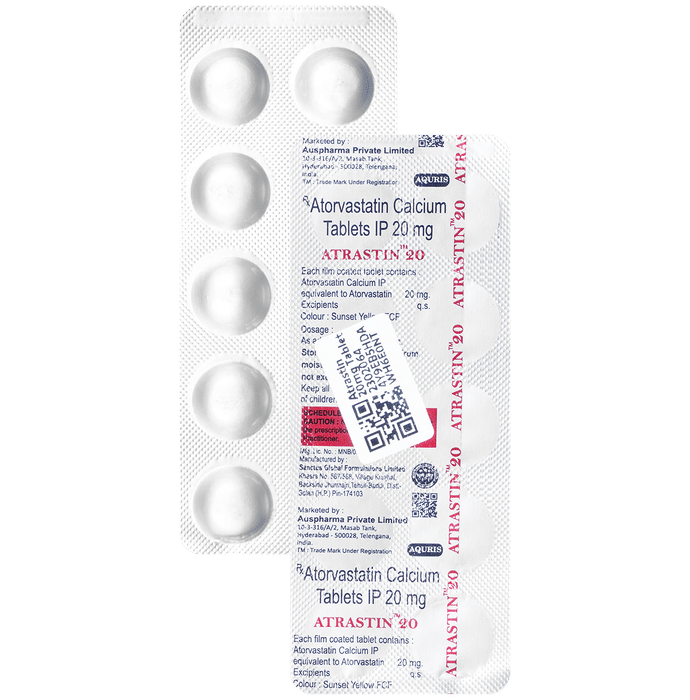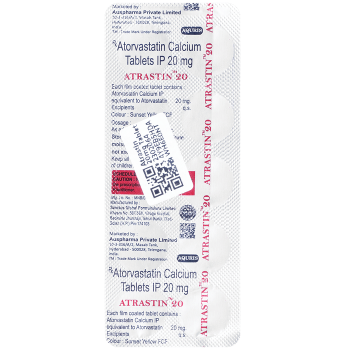 Manufacturer details:                                        Marketer details:Aush Pharma LLP | -314,KANARA BUSINESS CENTRE,LINK ROAD,LAXMI NAGAR NEXT TO GARDEN BUILDING,GHATKOPAR EAST MUMBAI Mumbai ,City,Maharashtra,India,400075,                                                Description:Atrastin 20mg Tablet belongs to a group of medicines called statins. It is used to lower cholesterol and to reduce the risk of heart diseases. Cholesterol is a fatty substance that builds up in your blood vessels and causes narrowing, which may lead to a heart attack or stroke. Atrastin 20mg Tablet is a widely prescribed medicine and is regarded as safe for long-term use when taken as per the doctor’s advice. It can be taken with a meal or on an empty stomach. You can take it at any time of the day but try to take it at about the same time each day. Most people with high cholesterol do not feel ill, but stopping your medicine may increase your cholesterol levels thereby increasing your risk of heart disease and stroke.It is important to have your cholesterol levels checked regularly. This medicine is only one part of the treatment program which should also include a healthy diet, regular exercise, smoking cessation, moderation of alcohol intake, and weight reduction. You can eat normally while taking this medicine, but try to avoid foods that are high in fat. Common side effects of this medicine include constipation, flatulence, dyspepsia, and abdominal pain. These are usually mild and disappear after a short time. Consult your doctor if they persist or if you notice any yellowing of your eyes or get repeated or unexplained muscle pains. This medicine should not be used in some conditions such as liver disease. Also, pregnant women and breastfeeding mothers should not take this medicine as it may harm the developing baby. Diabetic patients should monitor their blood sugar levels while taking this medicine, as it may lead to an increase in blood sugar levels. Your doctor may check your liver function before starting the treatment and monitor it regularly thereafter.