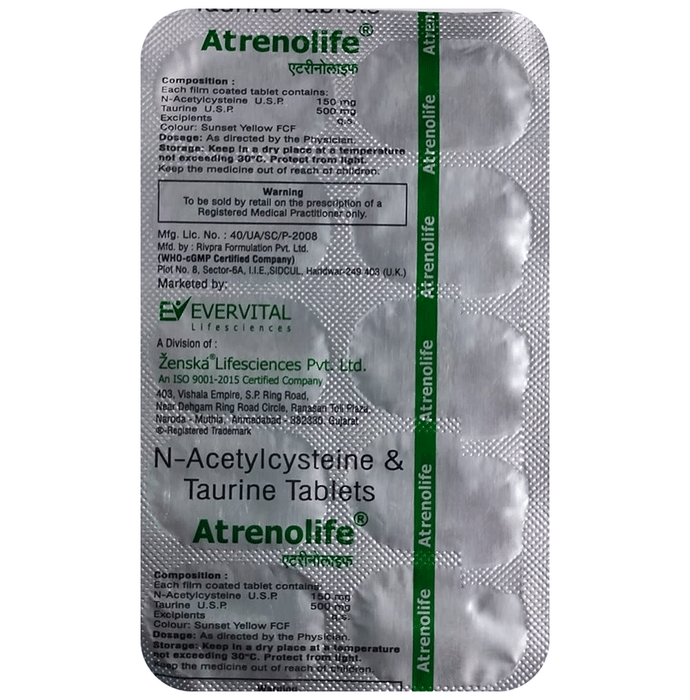 Manufacturer details:                                        Marketer details:Zenska Life Sciences Pvt Ltd | SHOP NO 29 FOURTH FLOOR DAWA BAZAR, R.N.T. MARG INDORE Indore MP 452001 IN,                                                Description:Atrenolife Tablet is a combination medicine used in the treatment of chronic kidney disease. It protects the kidneys from damage and reduces the risk of kidney failure. Atrenolife Tablet is taken with or without food in a dose and duration as advised by the doctor. The dose you are given will depend on your condition and how you respond to the medicine. You should keep taking this medicine for as long as your doctor recommends. If you stop treatment too early your symptoms may come back and your condition may worsen. Let your doctor know about all other medications you are taking as some may affect, or be affected by this medicine.The most common side effects are nausea, vomiting, fever, runny nose, diarrhea, abdominal pain, skin irritation and rashes, and throat irritation. These are temporary and usually resolve with time. Contact your doctor straight away if you are at all concerned about any of these side effects.Before taking it, you should tell your doctor if you have any kidney or liver diseases. Let your doctor also know about all the other medicines you are taking. Pregnant and breastfeeding women should consult their doctors before taking this medicine.