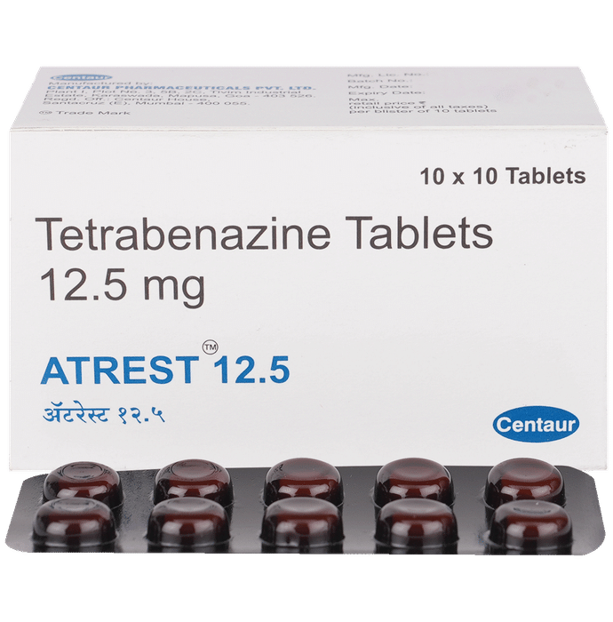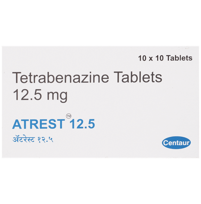 Manufacturer details:                                        Marketer details:Centaur Pharmaceuticals Pvt Ltd | CENTAUR HOUSE, Near Grand Hyatt, Vakola ,Santacruz – East, Mumbai – 400 055, India.,                                                Description:Atrest 12.5 Tablet is used to treat chorea (which is a movement disorder characterized by involuntary, jerky movements) associated with Huntington’s disease. It balances dopamine levels, reducing movements and improving function. This helps it easier for the person to move and function better. Atrest 12.5 Tablet should be taken with or without food. However, it is advised to take it at the same time each day as this helps to maintain a consistent level of medicine in the body. Take this in the dose and duration as advised by your doctor and if you have missed a dose, take it as soon as you remember. This medication must not be stopped suddenly without talking to your doctor as it may worsen your symptoms. However, discontinue this medicine immediately if you experience neuroleptic malignant syndrome, characterized by fever, muscle rigidity, and altered consciousness or seizures.Some common side effects of this medicine include nausea, insomnia(difficulty sleeping), anxiety, fatigue, akathisia (restlessness and inability to stay still), and depression. It also causes dizziness and sleepiness, so do not drive or do anything that requires mental focus until you know how this medicine affects you. Inform your doctor if you develop any unusual changes in mood or behavior, new or worsening depression, or suicidal thoughts while taking this medicine.