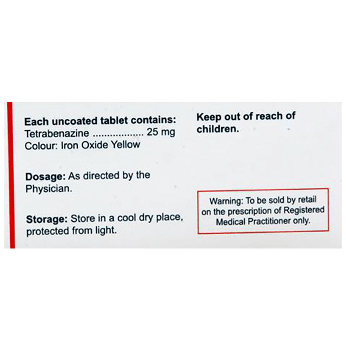 Marketer:Centaur Pharmaceuticals Pvt Ltd,Composition:Tetrabenazine (25mg),medicine_type:,