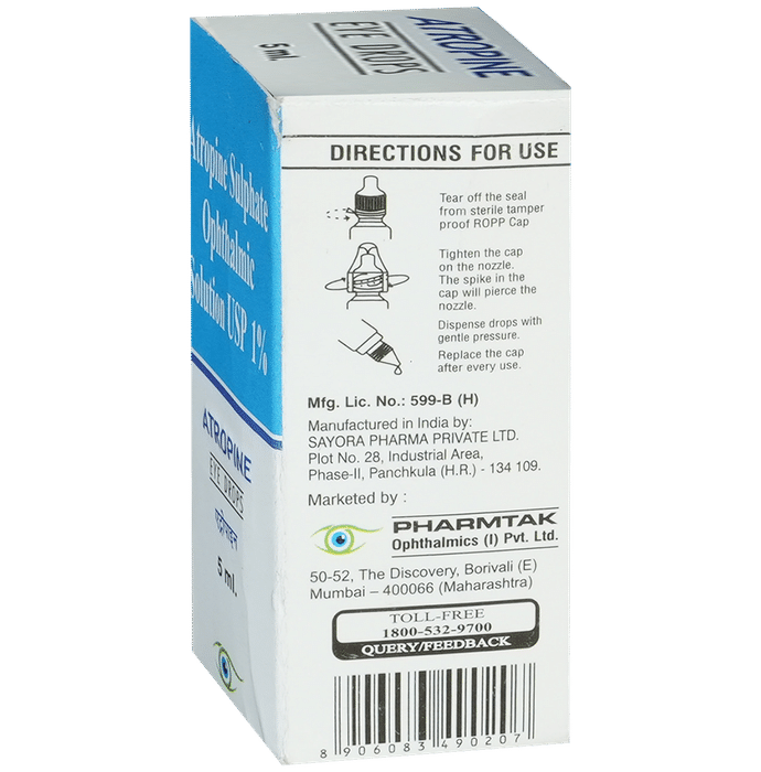Manufacturer details:                                        Marketer details:Pharmatak Opthalmics Pvt Ltd | 50-52, The Discovery, Dattapada Road, Borivali (E), Mumbai – 400 066, Maharashtra,                                                Description:Atropine 1% Eye Drop is used to treat myopia and inflammation in the eyes (uveitis or iritis). It is also used in induce cycloplegia for eye examination and diagnose eye problems like blurred vision or squint in children. Atropine 1% Eye Drop is for external use only. Use it in the dose and duration as directed by your doctor. Read the instructions carefully before using the medicine. Wash the hands thoroughly before and after using Atropine 1% Eye Drop. Doing so will help avoid the risk of any infection. Do not rub the eyes after instilling the medicine, as it can lead to redness or irritation. Continue the medicine until the prescribed course is complete.This medicine may have some minor and temporary side effects such as blurry vision, photophobia, decreased tear production, stinging in the eyes, and high blood pressure. These episodes should start receding after a few doses. However, if these side effects persist or become bothersome for your child, report to the doctor without any delay.Before you use this medicine, let your doctor know if you have a history of allergic reactions with any of the components of this product. Let your doctor also know about any medical conditions such as heart problems, blood disorders, airway obstruction, lung anomaly, gastrointestinal problems, skin disorders, liver impairment, or kidney malfunction. Pregnant and breastfeeding women should consult their doctor before using this medicine.