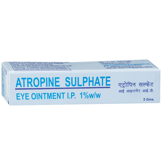 Package:Tube,Qty:5 gm,Product Form:Eye Ointment ,prescription_required:Prescription Required,Fact_Box:Chemical Class :: Natural Alkaloids|Habit Forming :: No|Therapeutic Class :: OPHTHAL|Action Class :: Anticholinergics, primary_use:Treatment of Uveitis|Treatment of Myopia|Cycloplegia,storage:Store below 30°C,                  common_side_effect:Stinging sensation | High blood pressure | Decreased lacrimation | Blurred vision | Photophobia,      MANUFACTURER_ADDRESS:548 , Udai Marg , Tilak Nagar , Jaipur-302004 (Rajasthan),        country_of_origin:India,Q_A:</q_a>,                            How it works:,